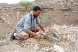 Le chef de projet Zeresenay Alemseged avec le fossile d'un rhinocéros vivant à la même époque que les premiers hominidés armés d'outils. Crédit : Projet de recherche Dikika