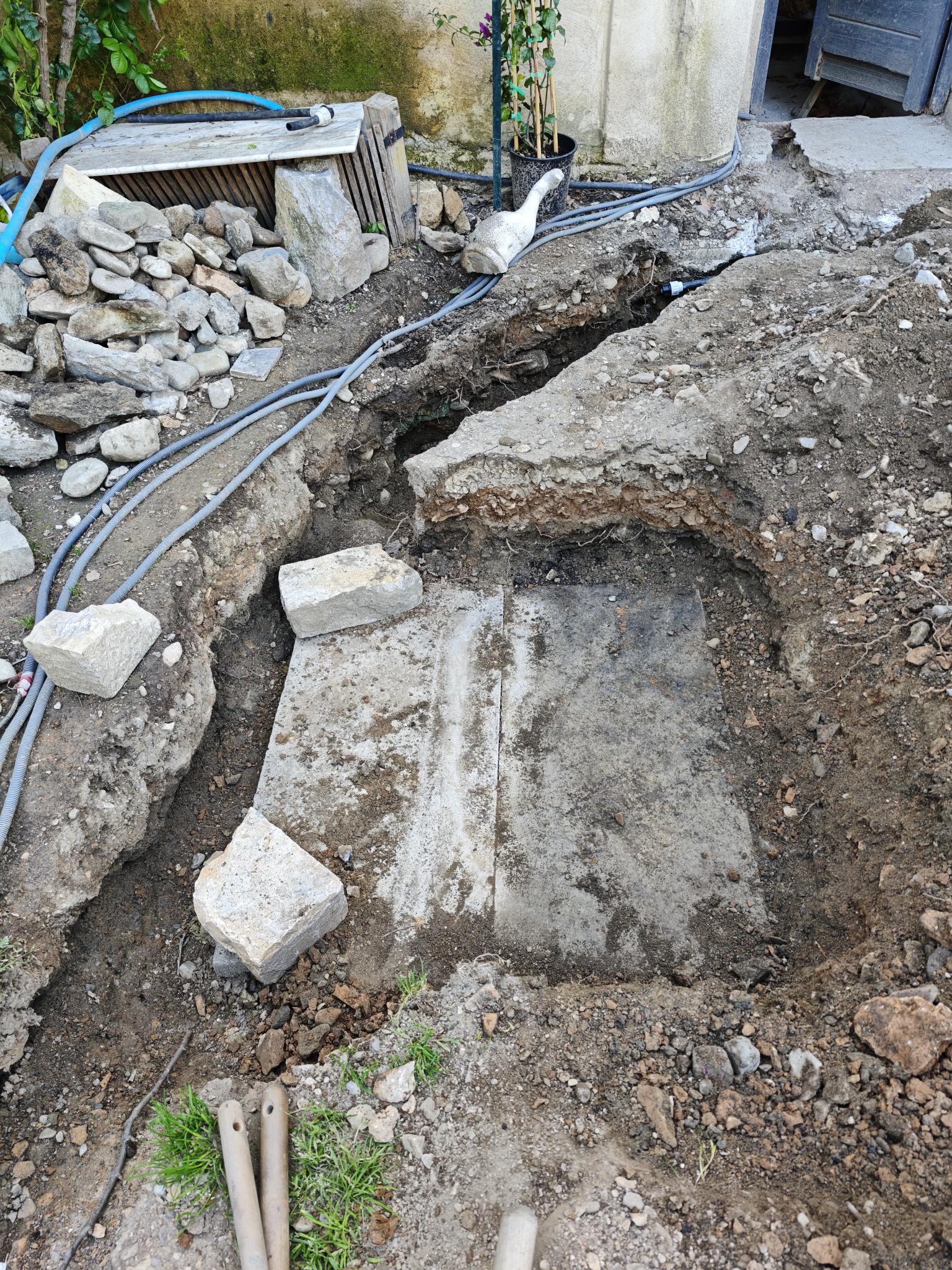 En creusant une tranchée dans le jardin pour enterrer des gaines, je suis tombé sur une pierre d’environ 10 cm de hauteur sur 1 mètre de long, avec une gravure sur le dessus (j’avoue avoir eu un petit coup de chaud à ce moment-là photo 1).