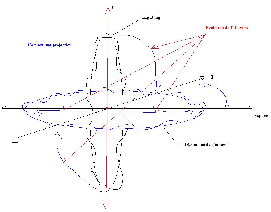 Je dois donc considérer l'Univers comme étant une sphère 3D en expansion dans un espace 5D, où il y a deux dimensions de temps, l'une universelle de temps T = âge de l'Univers, l'autre locale de temps t = (Vt / VT) T avec (t / T) < 1.