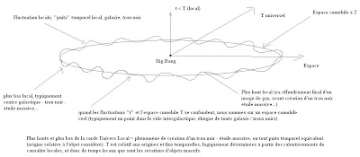 Je peux alors considérer qu'il y a non pas un temps dans l'Univers mais des temps sphériques t locaux, qui ont des vitesses Vt différentes. De Vt = zéro à la surface des trous noirs, à VT = 1 par convention (Vitesse du temps comobile), essentiellement dans l'espace situé à bonne distance de tout puits temporel.