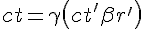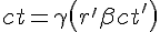 (2) Je vais tâcher d'écrire la transformation de Lorentz sous forme vectorielle. je représente un vecteur (d'espace ) par une lettre grasse: r=r'+ (1/(1-béta2)(1/2)-1)(r'.v)(v)/c2+vt'/(1-béta carré)(1/2). En ce qui concerne t', on a: t=((t'+r'.v/c carré))/(1-béta carré)(1/2). Dans ces formules, r représente le vecteur d'espace x,y,z désigné par r. L'énergie est la composante temporelle du quadri-vecteur impulsion-énergie, dont les composantes d'espace décrivent l'impulsion. Ce quadri-vecteur se transforme exactement comme r,t, puisqu'il s'agit d'un quadrivecteur.