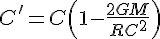 Revenons à l'effet Shapiro qui, amha, ne devrait concerner que l'allongement du temps de parcours puisqu'on peut le calculer pour une trajectoire radiale. Pour l'observateur à l'oo un photon à une distance R du centre de la source du champs de gravitation parcourt une distance dr en un temps dt à une vitesse C' telle que![]()