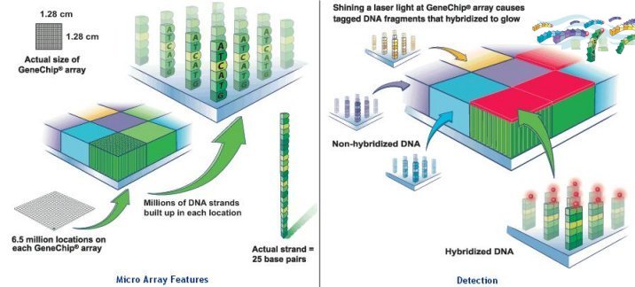 Ce sont des petites plaques en verre de 1,28 cm de coté contenant 300 000 puits dans le fond desquels sont greffé (par liens covalents) des fragments monobrins d'oligonucléotides synthétiques de séquence différente (±25 dNMP : des Désoxynucléoside monophosphate), séquences qu’on désirer tester pour voir si elles ne sont pas exprimées dans une cellule tumorale/malade par exemple.