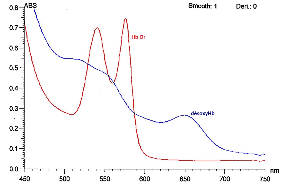 Cependant, en ce qui concerne la déoxyhémoglobine, nous avons vu qu'elle prenait une couleur bleue (phénomène observable par la cyanose des tissus en cas d'hypoxie grave) mais je n'arrive pas à trouver d'explications sur le net. De toute évidence, elle devrait être équivalente à celle de la couleur de l'oxyhémoglobine, cependant, d'après ce graphique, la déoxyhémoglobine absorbe plus dans le bleu, que dans le rouge...