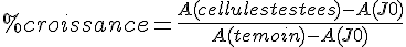 avec A l'absorbance, les cellules testées : celles auxquelles on a ajouté les toxiques, A(J0) l'absorbance mesurée le jour de la mise en culture, avant le début de la croissance. J'aimerais être sûr que le pourcentage d'inhibition est égal à :