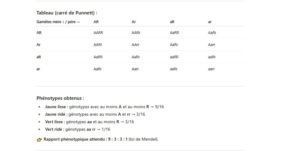 Or, si on fait le croisement F1 × F1 (AaRr × AaRr), on obtient bien le rapport 9:3:3:1 (jaune lisse majoritaire), et non pas autant de chaque phénotype (cf. carré de Punnett joint dans la piece ci dessus).