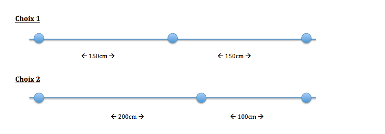 Choix 1= Soit je le mets pile au milieu, à 150. Dans ce cas là, je dois mettre un rideau de chaque côté, mais ce qui est plus compliqué ensuite c’est de trouver des rideaux grande largeur car souvent, la norme est de 140.
