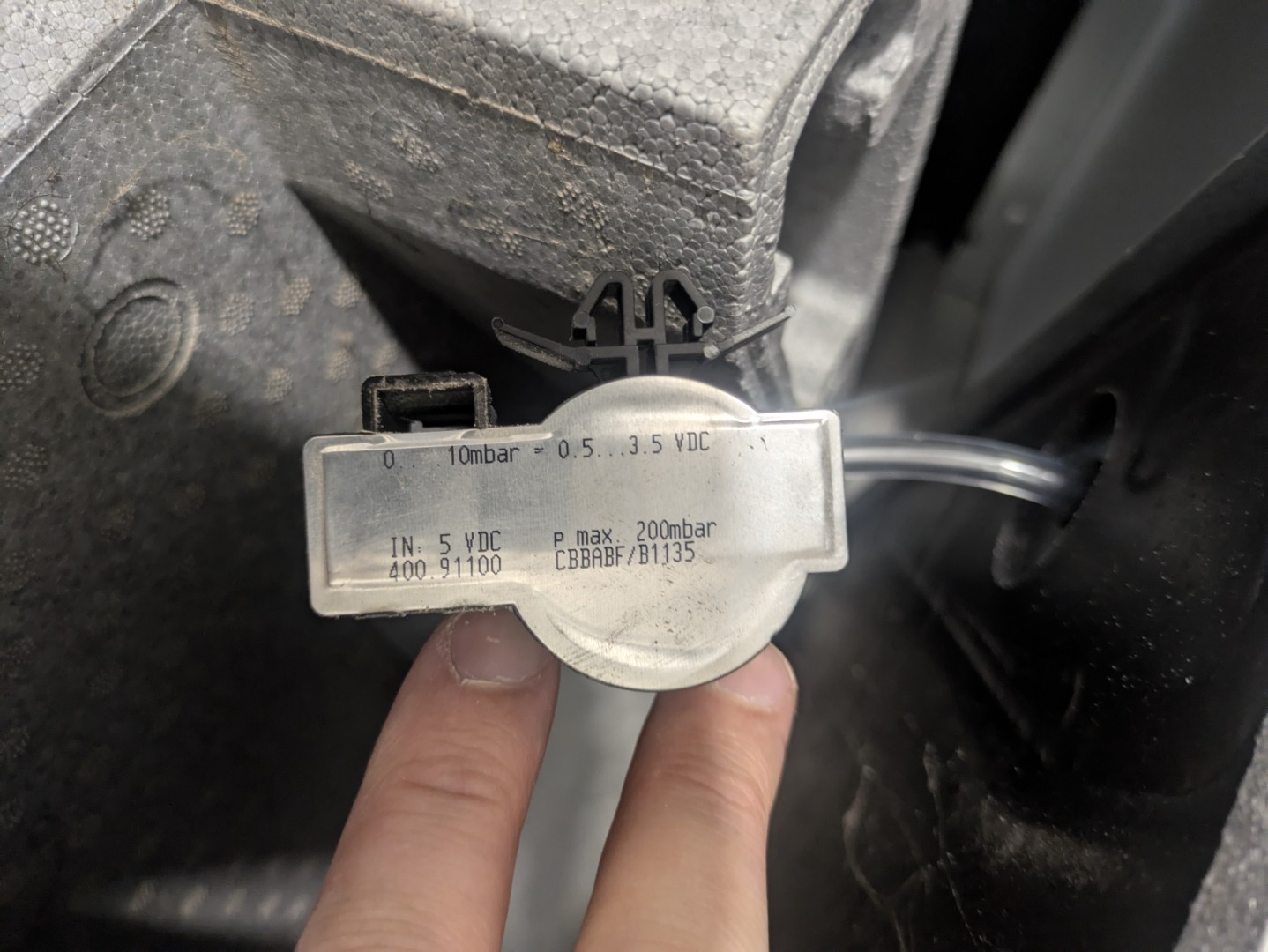 - Du coté interne de l'enceinte de l'échangeur de la VMC au niveau de l'arrivée de l'air extraite (air vicié), on trouve le corps du capteur avec je suppose la membrane permettant de mesurer la pression (c'est de ce coté qu'il est relié à trois fils).