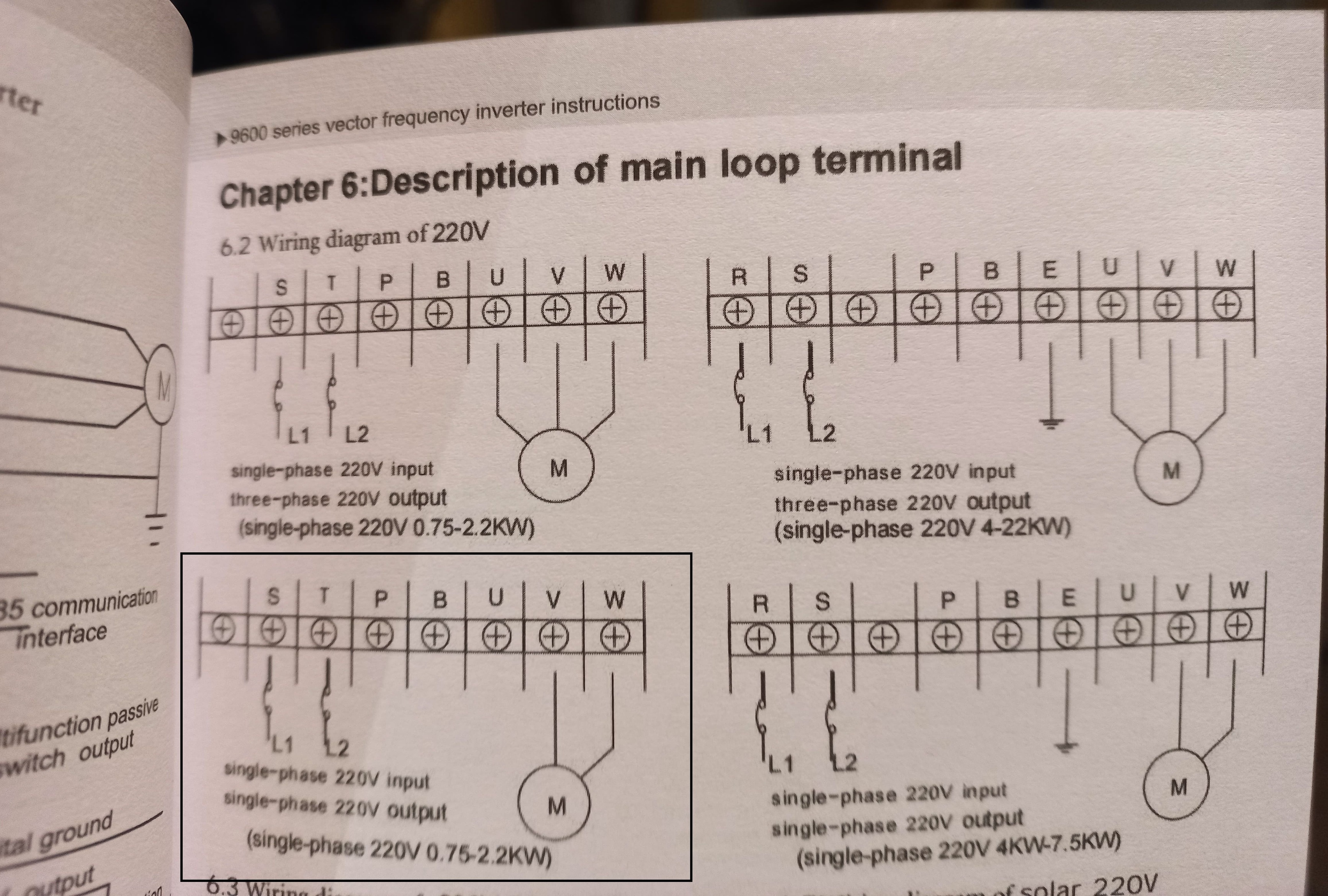Re bonjour, bon j'ai essayé de câbler comme annoncé avant (neutre et phase sur les bornes L1 (phase) et L2 (neutre) du variateur, moteurs en paralleles en sorties V et W). Sur le schéma de la notice il n'était pas indiqué de raccorder la terre mais je l'ai mise sur la borne E (comme pour les modèles de plus fortes puissances). Allumage, divers controles dans les réglages; je n'ai pas touché à grand chose en fait, j'ai passé le paramètre G/P type display en type P pour couple variable (indiqué "ventilateurs et pompes") et le "rated motor power" à 0.4kw. Sinon les autres paramètres (aux moins ceux que je comprend, incroyable la quantité de réglages..) je n'ai pas touché.