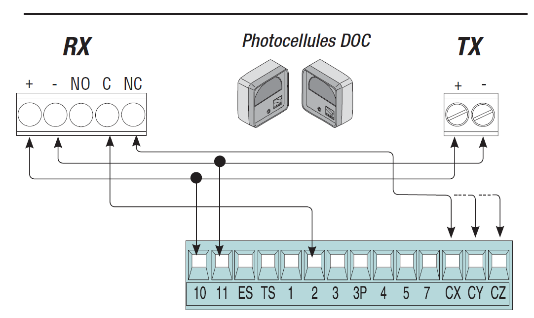 Si je réactive la sécurité, et mets la cellule en court-circuit (bornes 2 et CX ci-dessous), alors cela fonctionne aussi.