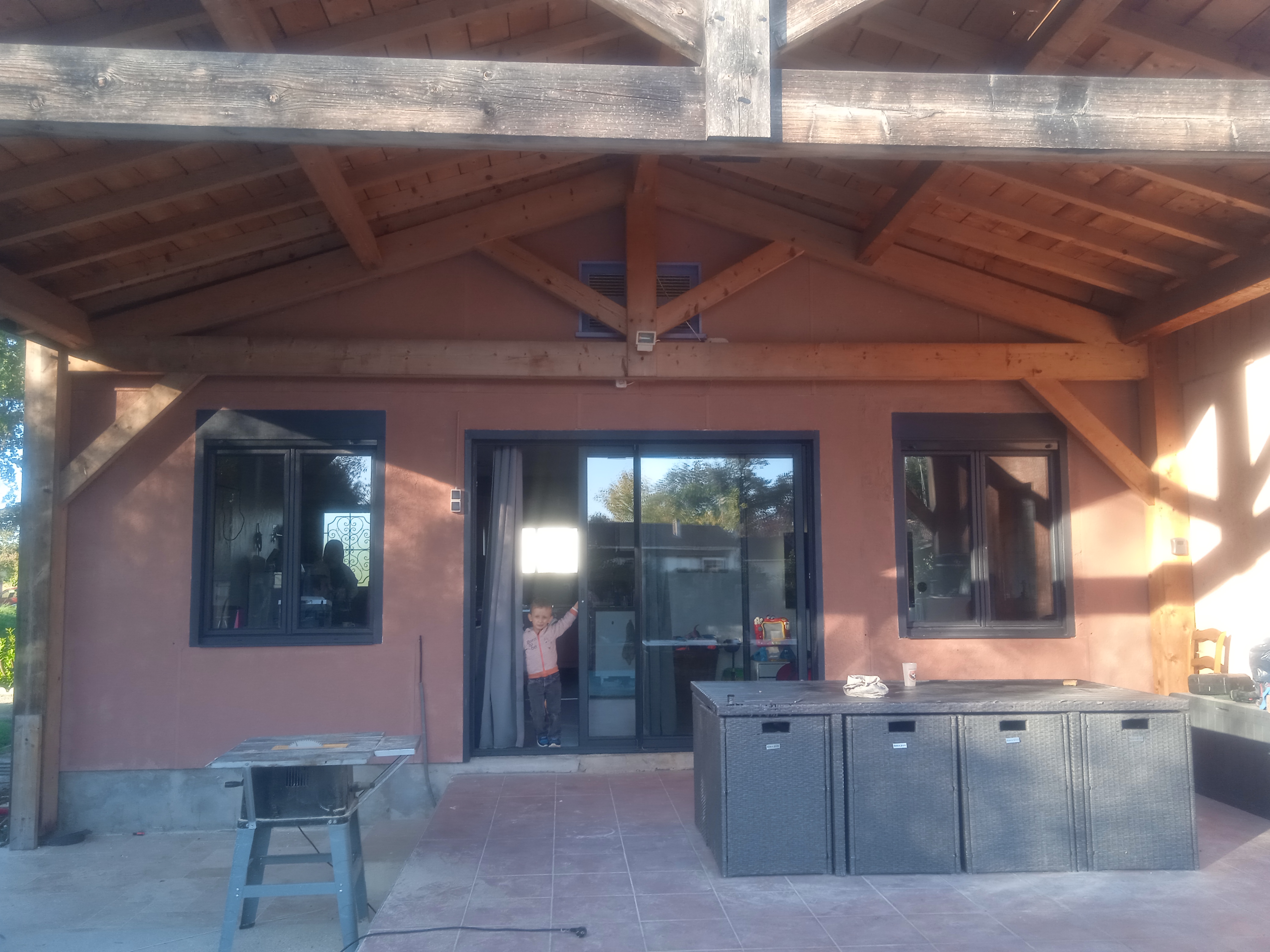 C est une ossature bois isolation laine de verre donc partant de l exterieur un crepi sur une plaque d eternite bastaing de 48 sur 125 et le placo interieur