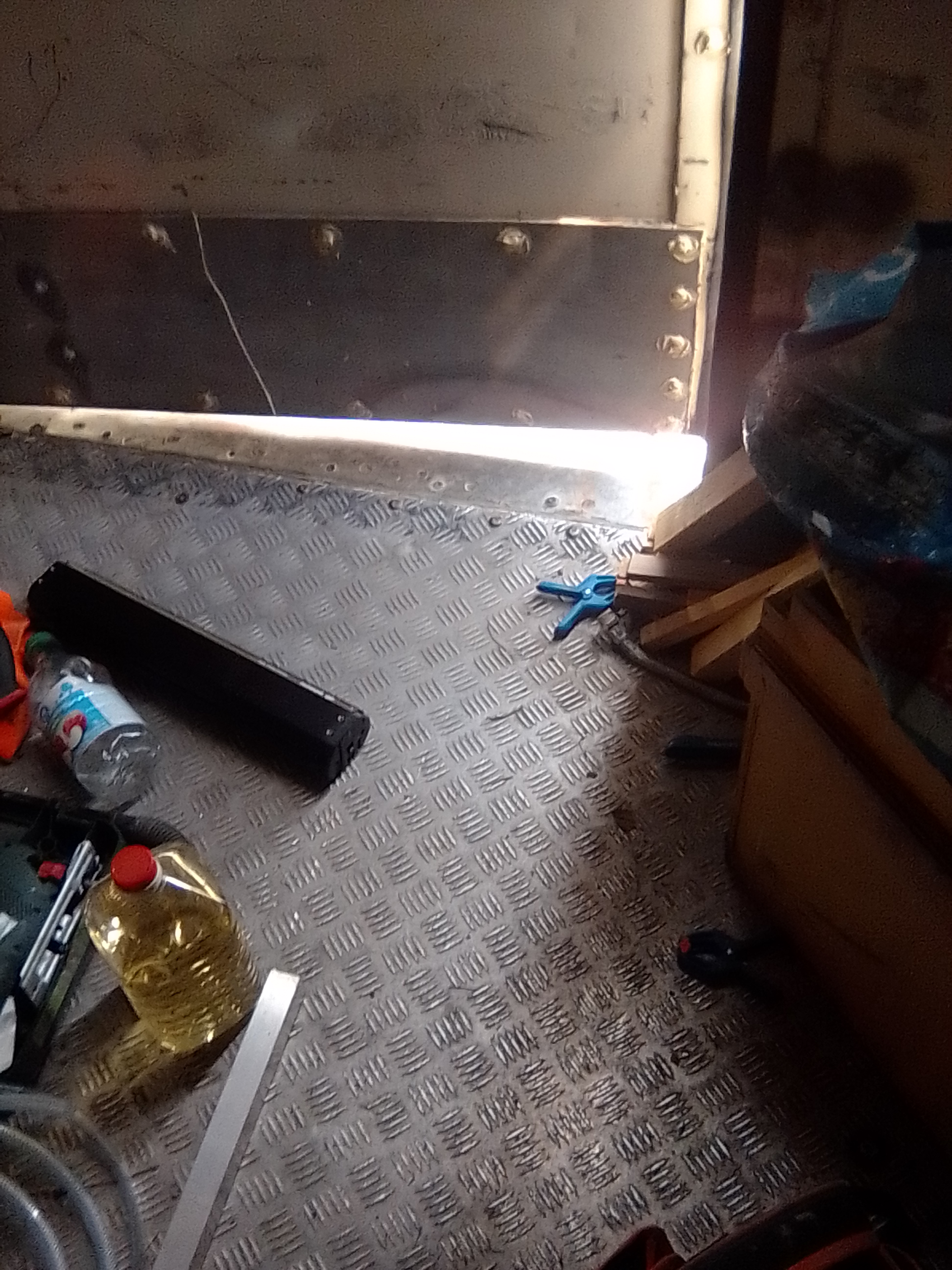 Mais je me pose une grande question savoir si je garde les plaques d'aluminium qui ont étés posées sur la partie arrière du camion. On voit à la forme qu'à certains endroits le sol d'origine (en genre de résine isolante) a du subir des affaissements (liées au poids des monte charges d'après un amis qui connait) et que ces plaques ont étés posées en renforts.