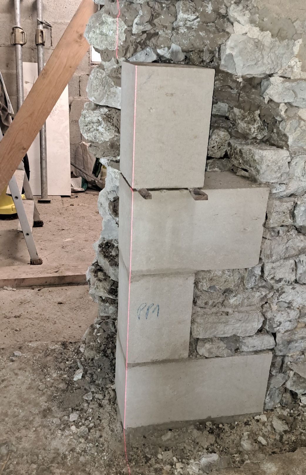 Je procède comme pour des parpaings avec un lit de mortier de chaux NHL3.5, mais le mortier semble prendre quasi instantanément à partir du moment où il est mis en pression. L'ajustement des blocs en "tapotant" dessus comme on fait avec des parpaings avec du mortier de ciment n'est donc pas du tout facile.