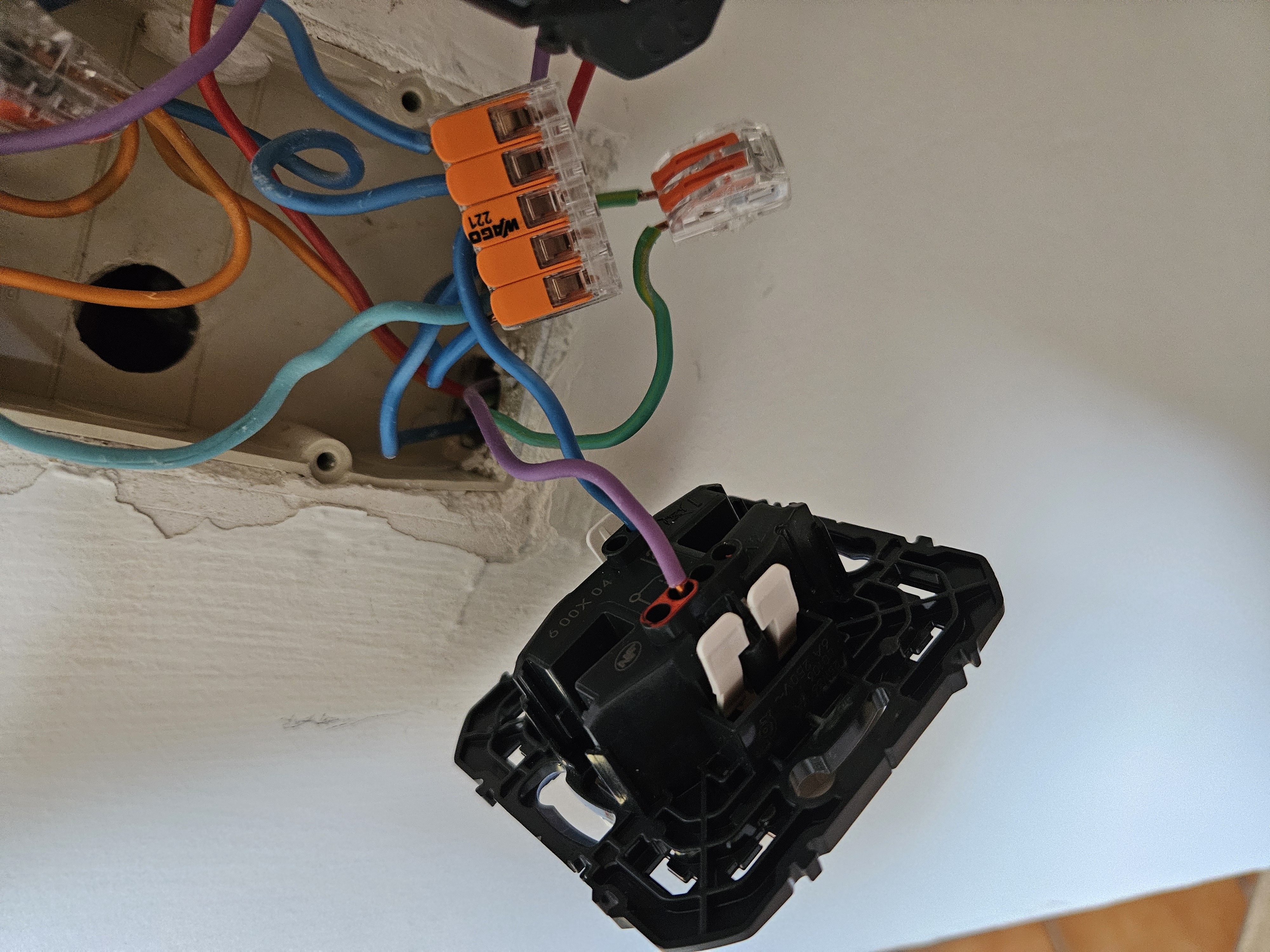 Je pense qu’il faudrait repartir ces deux fils vers les deux circuits (fixe et va-et-vient), peut-être via un pont, mais je suis bloqué car les deux entrées rouges du fixe sont déjà prises.