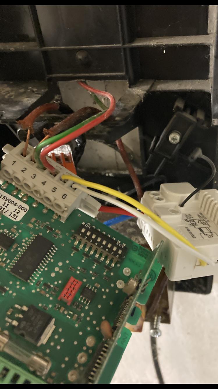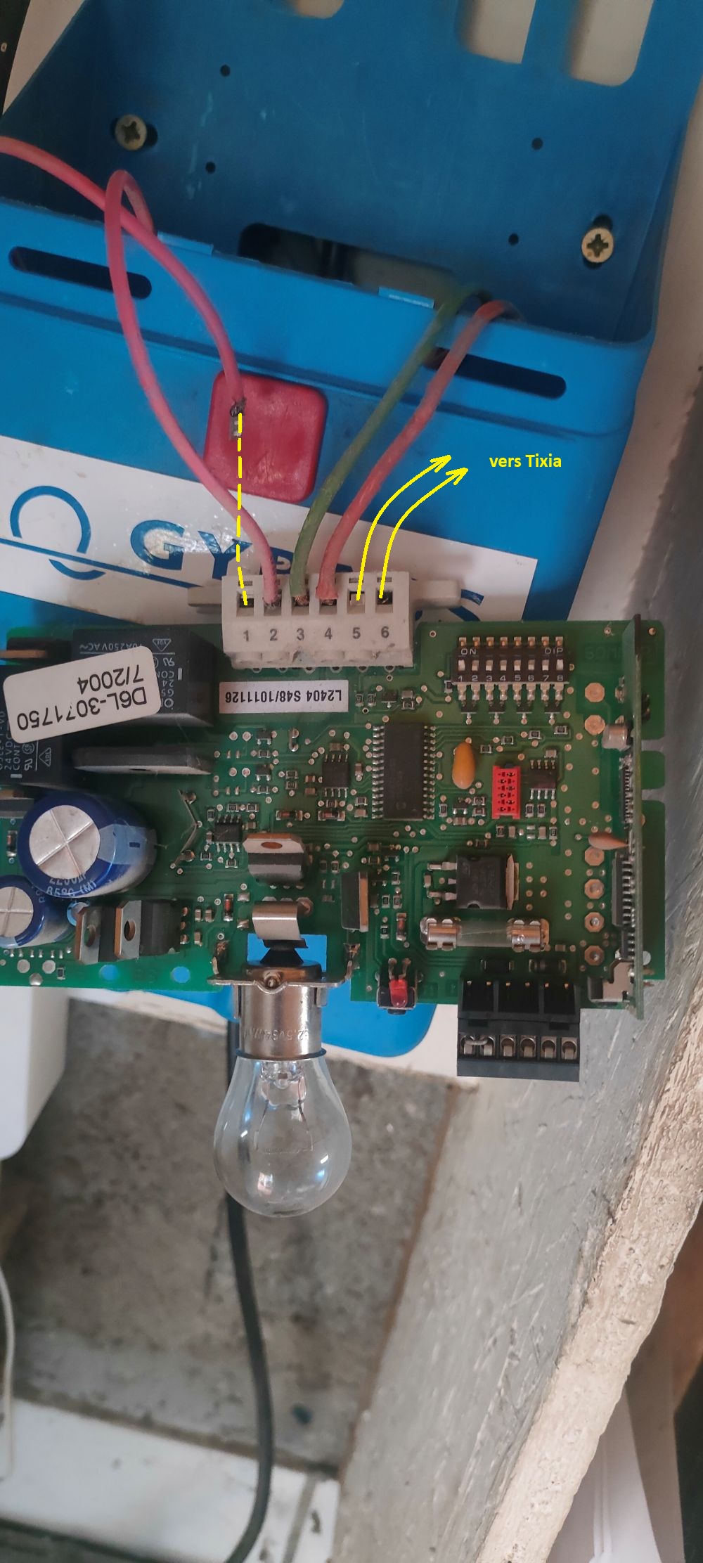 J’ai alimenté le Tyxia avec des wago depuis l’alim principale et branché les câbles de commande de ce dernier sur les entrées 5 et 6 de la carte, comme indiqué dans la doc en PJ page 16 pour installer un interrupteur supplémentaire (quand je fais un shunt 5/6 la porte s’ouvre)