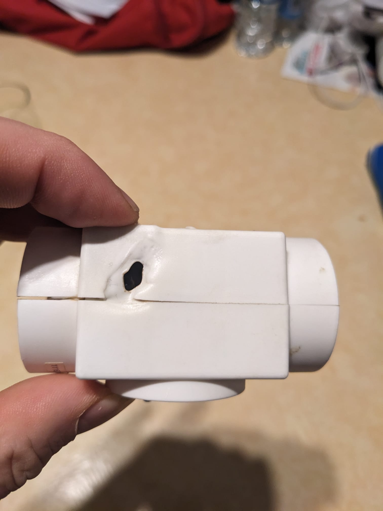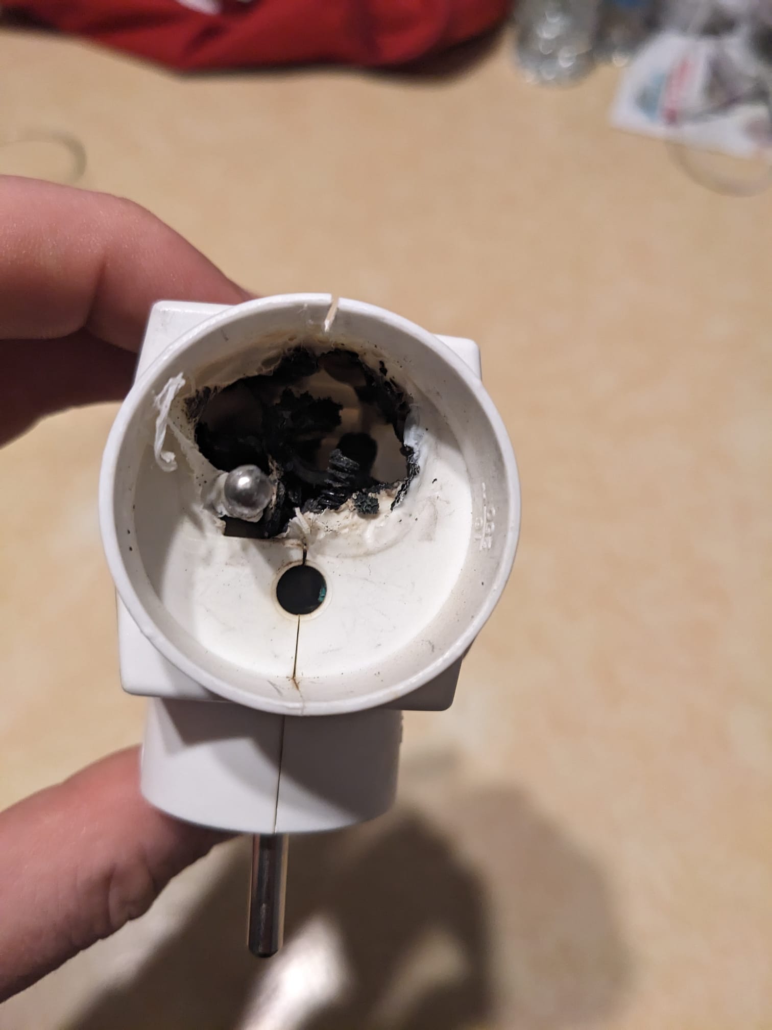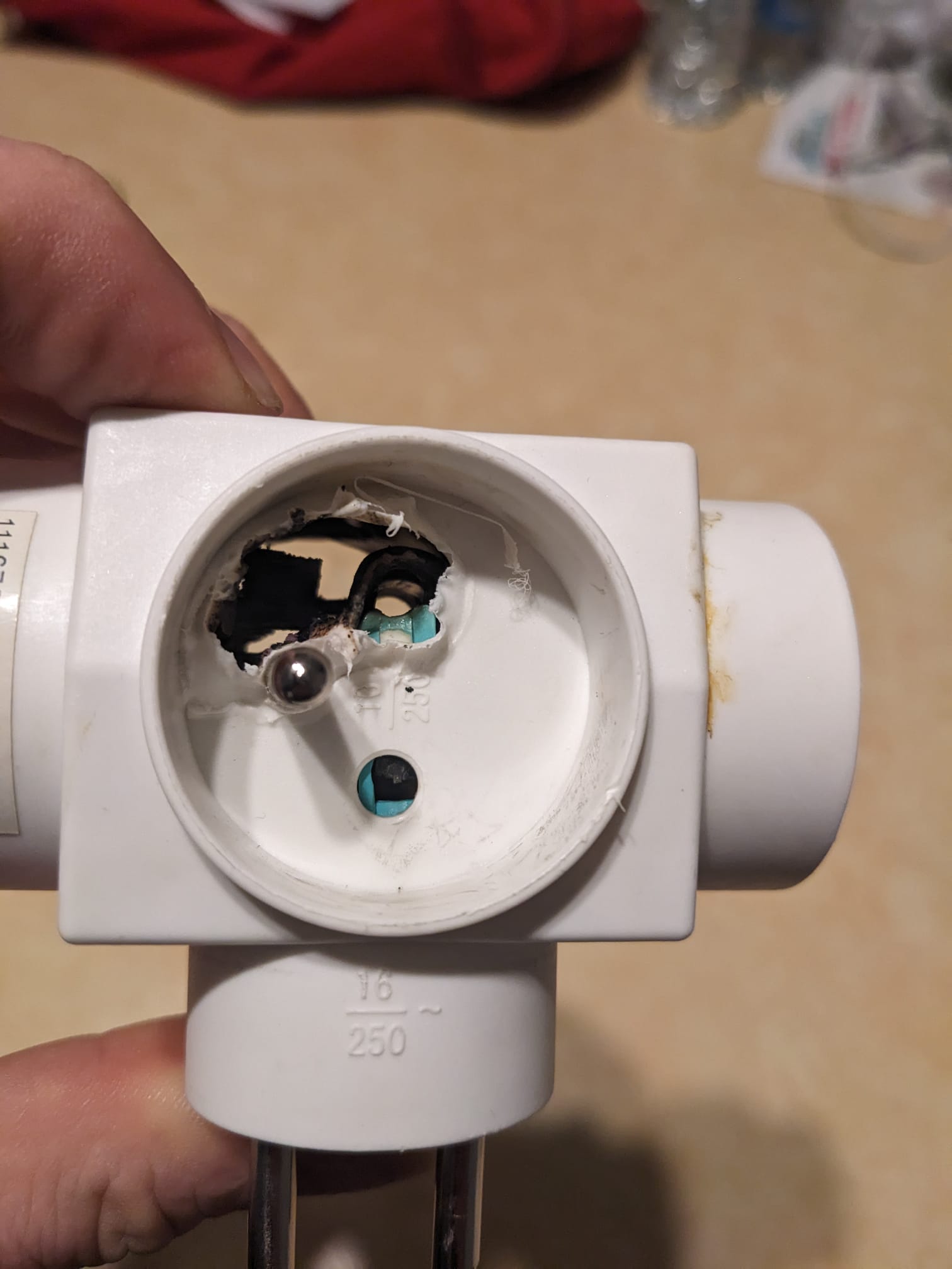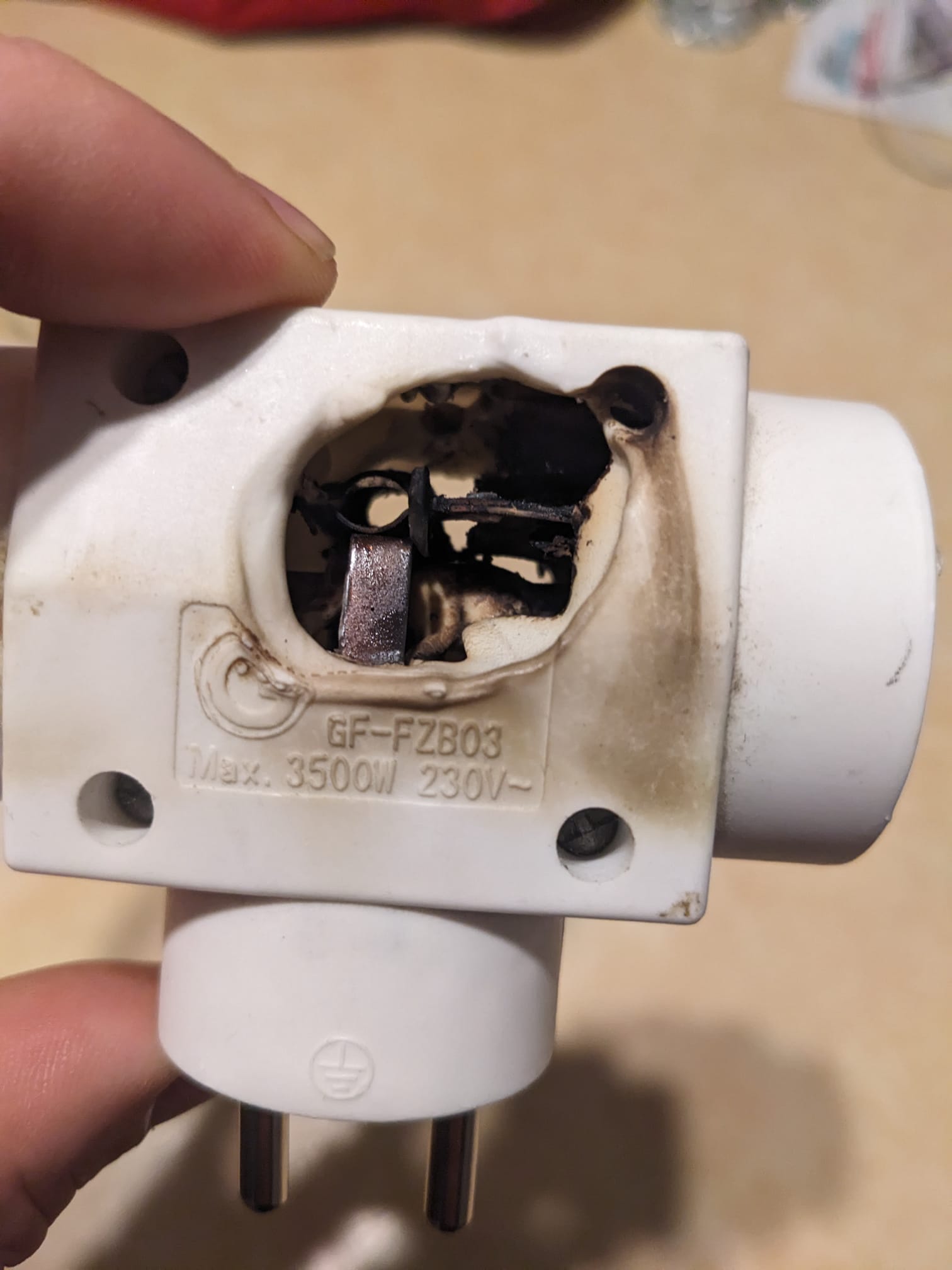 Bonjour, j'avais une multiprise 16A qui vient de fondre (très profondément, je peux voir à travers avec un trou de 2cm de diamètre), elle desservait un chauffe-eau solaire auto-vidangeable qui était branché dessus avec deux prises : la résistance thermique de 2500W, et la régulation/pompe pour faire circuler l'eau morte entre le capteur et le ballon quand nécessaire.