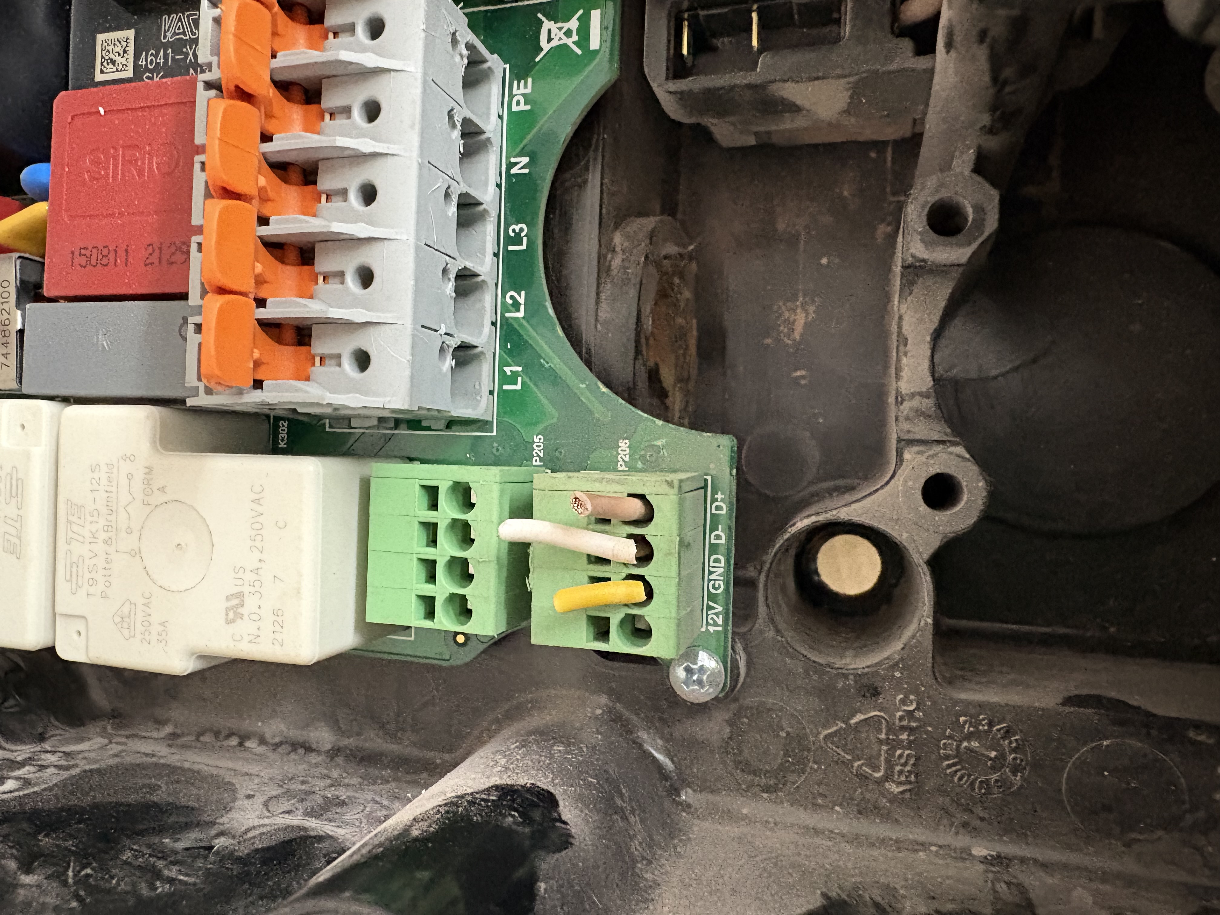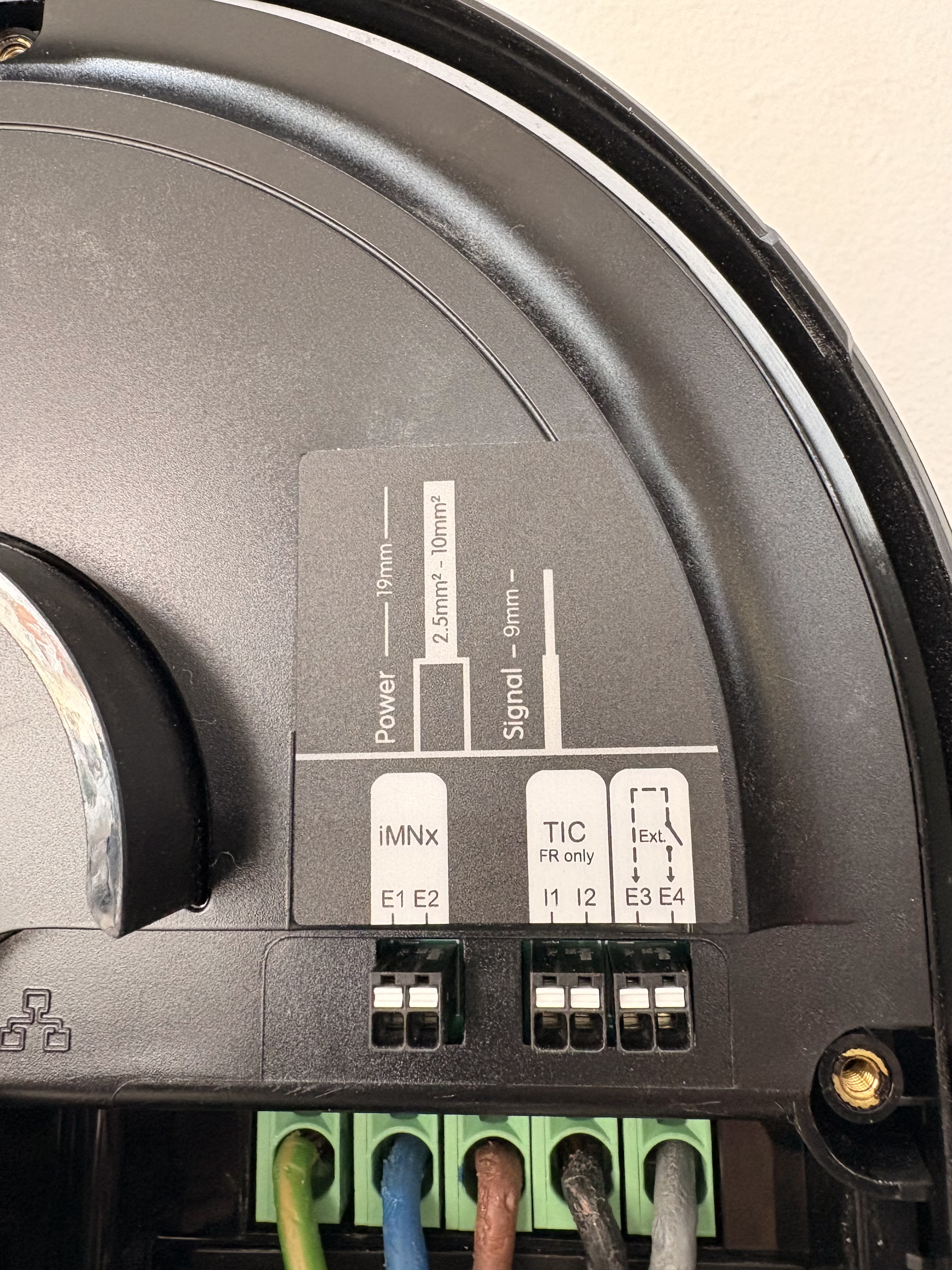 lors de ma dernière discussion concernant une borne de charge wallbox en panne, vu l'urgence ,je viens de la changer pour une borne Schneider envik 7,4 kw, la précédente avait un délester EM 340 carlo gavazzi avec trois fils, par contre la nouvelle bonne a différents contacts comme je n'ai pas d'information pour le branchement soit sur iMNX ou TIC, auriez vous des informations pour le branchement, je vous joins trois photos une photo branchement borne précédente et l'autre borne nouvelle merci pour votre aide krysabel