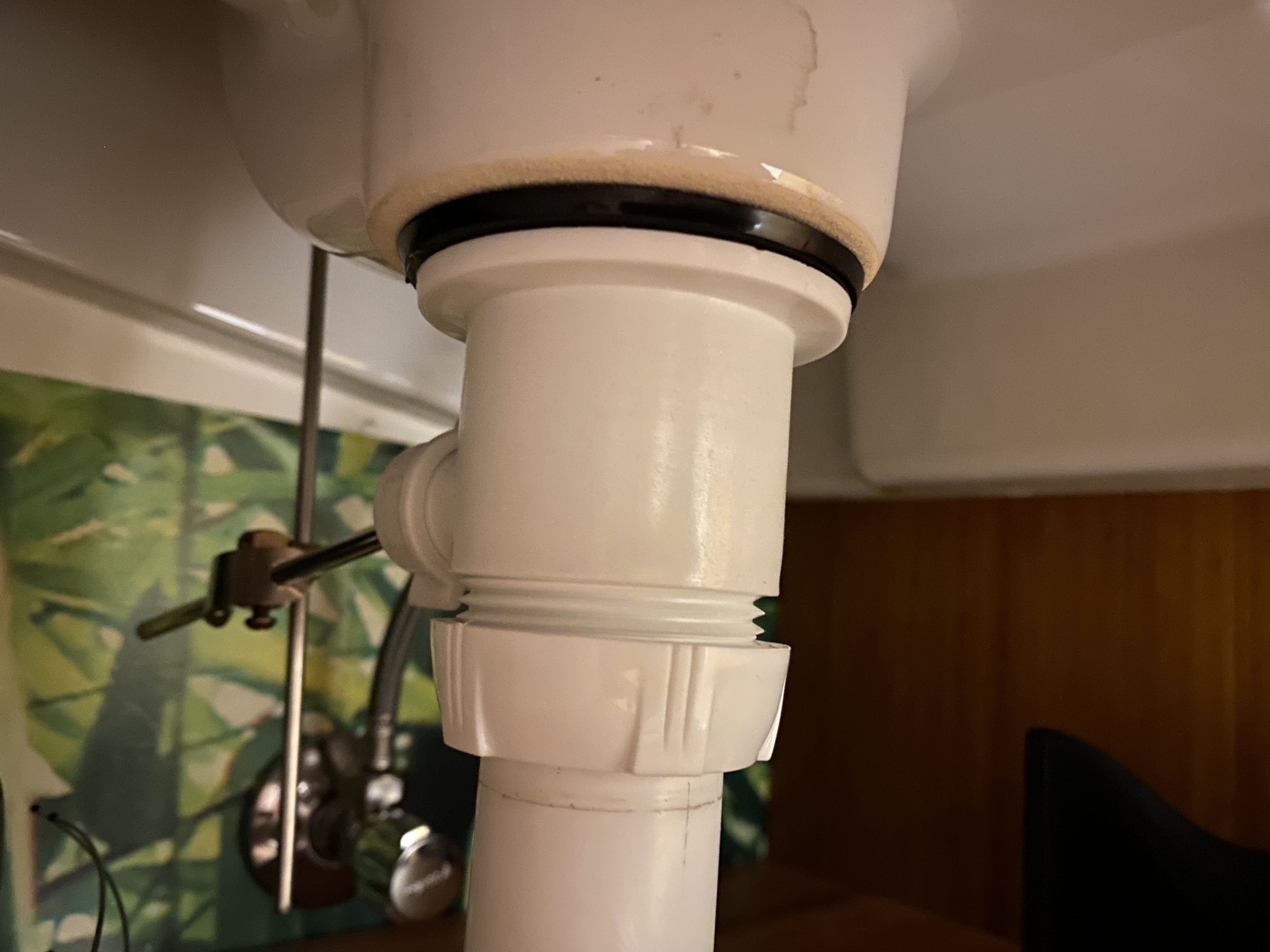 À titre de comparaison j’ai l’impression que celui qui avait fixé la bonde avant n’avait justement pas pu visser à fond (pour que ce soit bien aligné) et avait sans doute bourré de silicone pour rendre le tout étanche.