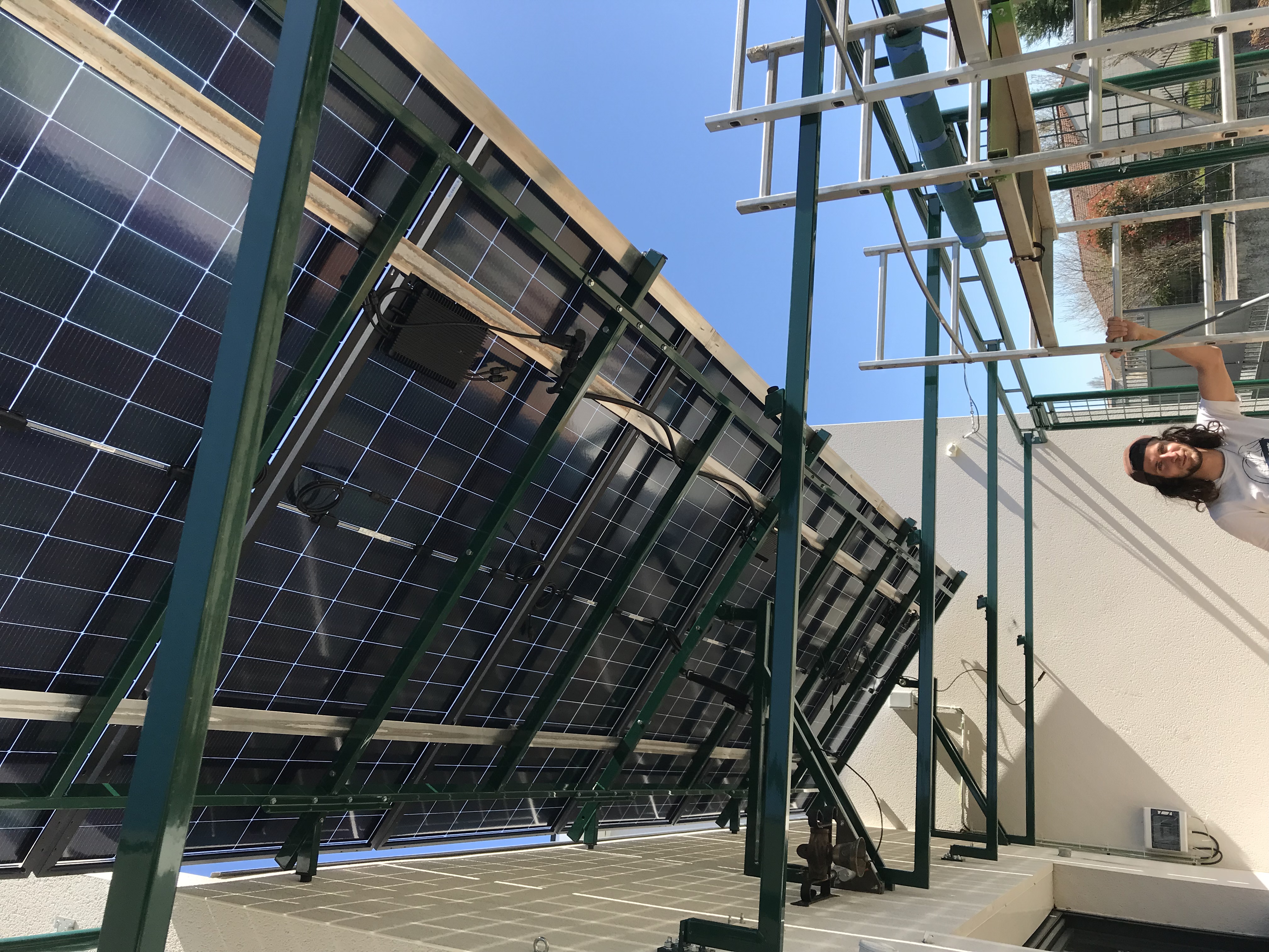 Cette position est variable grâce à un Verin monté sur le structure et qui "optimise" l'angle des panneaux suivant la variable printemps, été , automne, hiver.