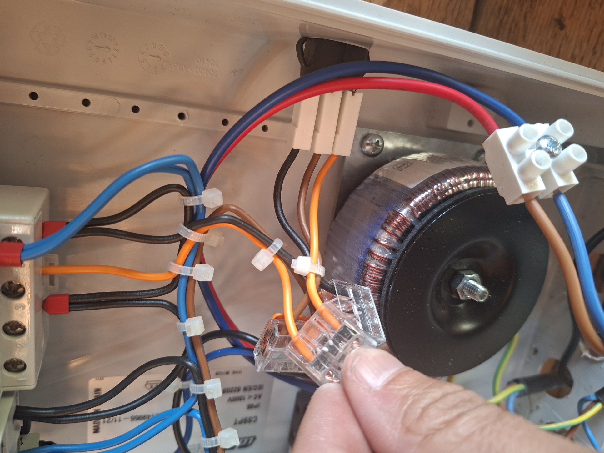 Un fil orange est branché en borne 3 et part vers un bouton 3 positions (fiche du bas).