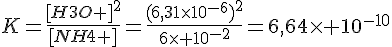 1. On dissout une masse m=0,32g de chlorure d'amonium dans l'eau, de façon à obtenir un volume V=100 mL de solution. La mesure du pH de la solution obtenue donne pH=5,2.