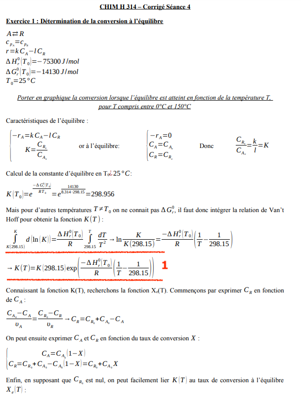 La correction utilise la formule 1 en rouge (Van't Hoff intégré) dans laquelle on insère la formule 2 en rouge (on remplace par son expression en fonction de X) et ensuite on inverse :