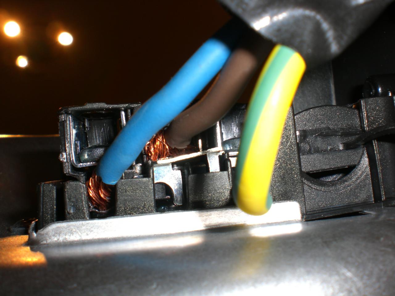 - les 3 fils du cable d'alimentation (marron, bleu, jaune/vert) sont déjà vissés dans le bornier.