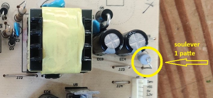 carte sous tension 230v , résistance levée d'une patte , j'ai pris la tension DC aux points indiqués, c'est à dire sur les pattes d'un condensateur , et rien du tout...