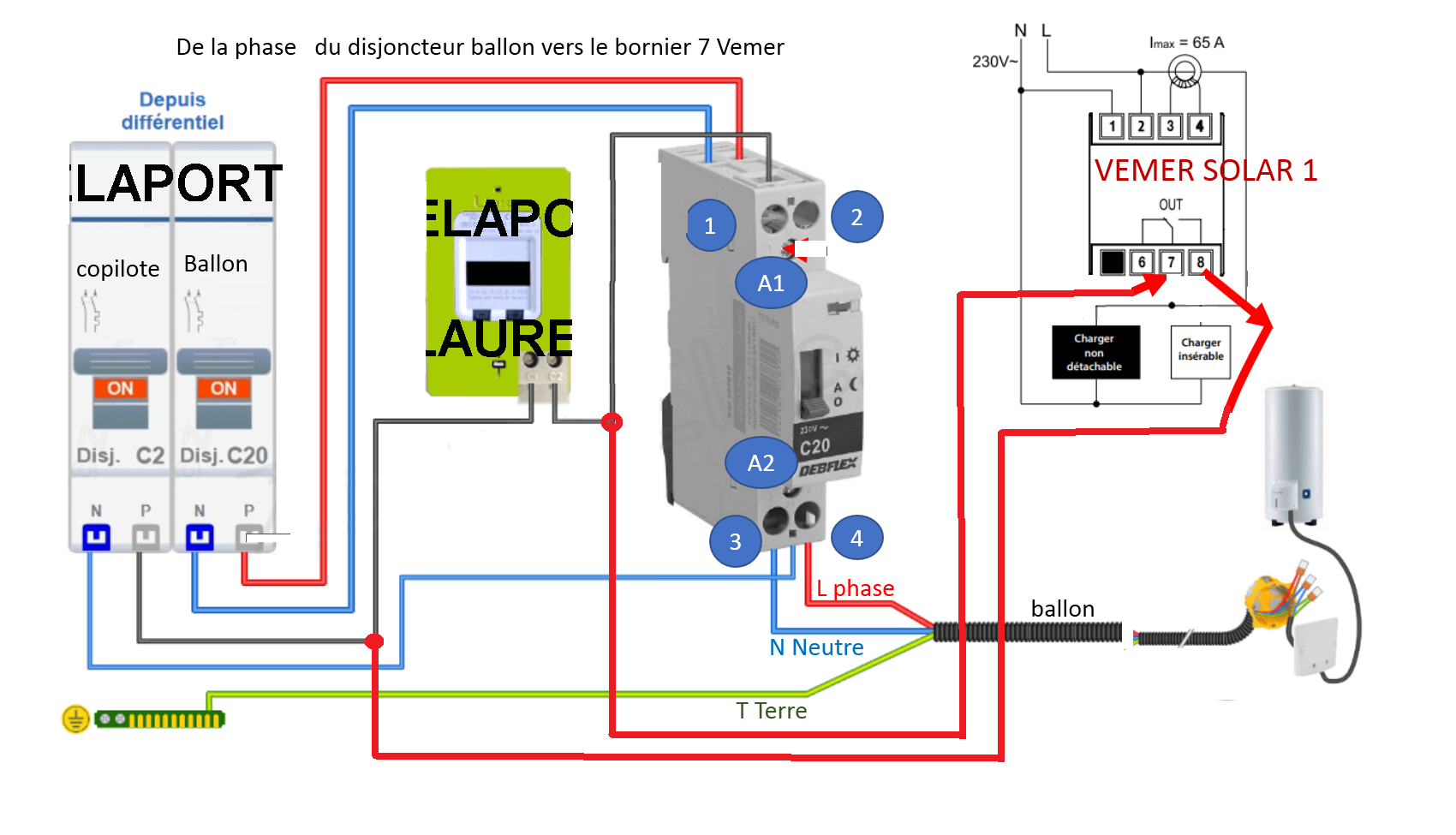 connexion relais contrôle de charge solaire Vemer solar1 pour optimiser ballon d'eau chaude