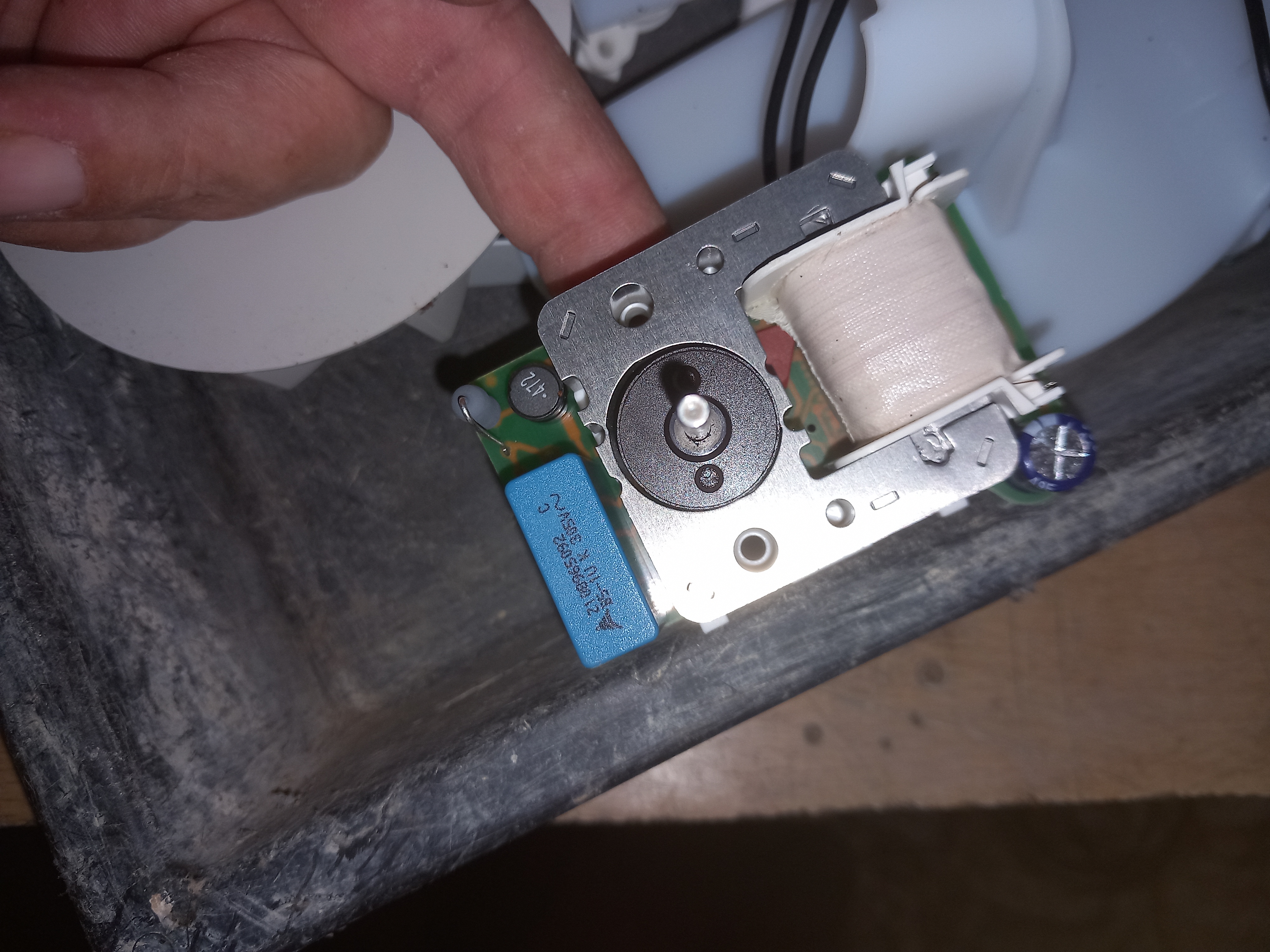démontage du ventilateur, essais sur établi. Le 220v est diminué à 18v AC jusqu'à ce qui ressemble à un mini pont de diode, avec 18v CC en sortie. Ces 18v n'arrivent pas jusqu'au bobinage.