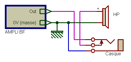 Si on insère un écouteur, cela soulève le V et le circuit vers le HP est interrompu, mais va vers l'écouteur par le contact en V.