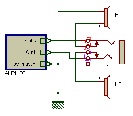 Lorsque tu n'insères pas la fiche mâle jack, le signal chemine vers le HP par la connexion rose, qui passe par l'interrupteur à lame représenté par le fil avec une flèche et l'autre avec le V.