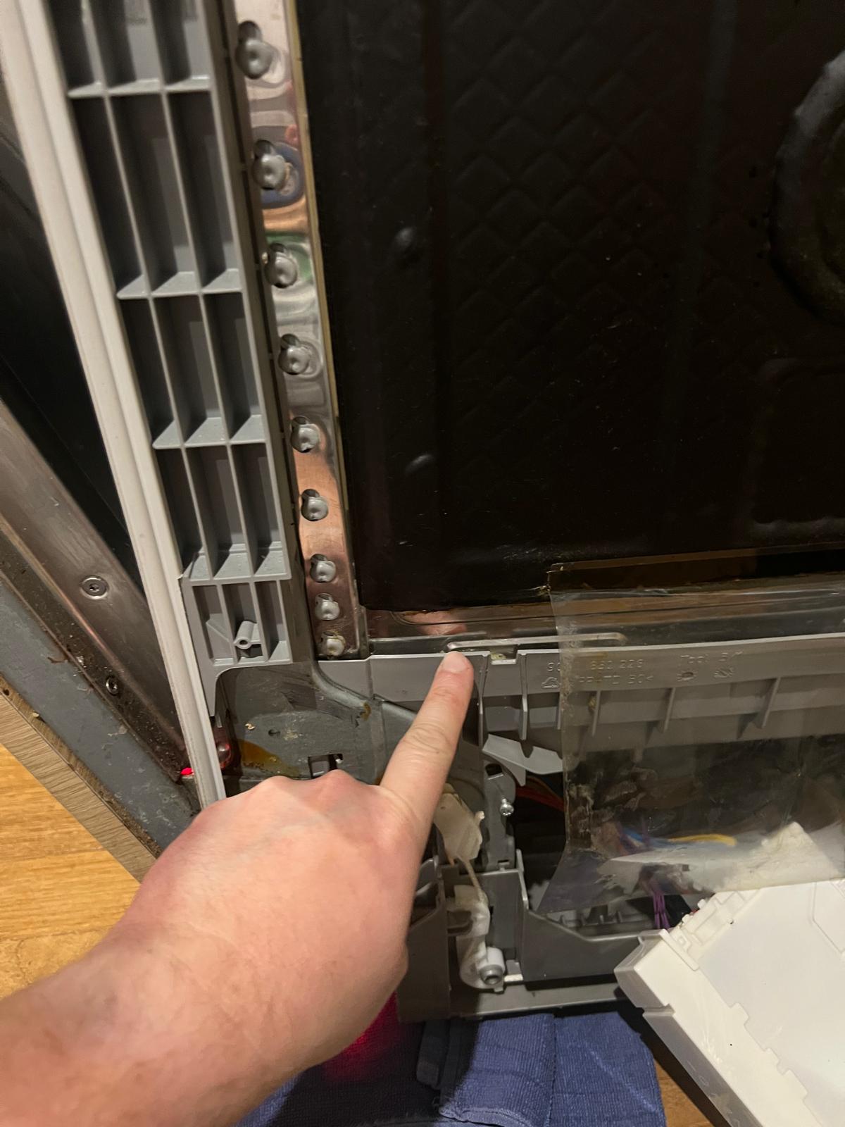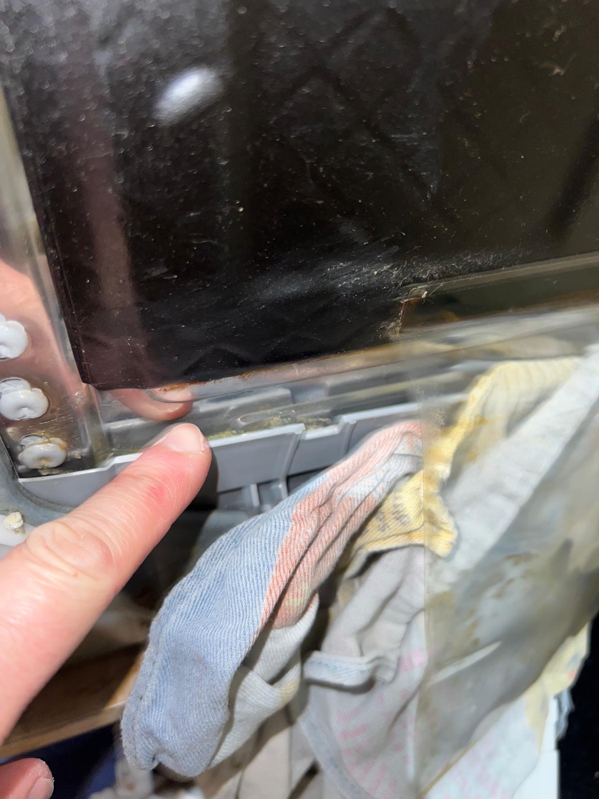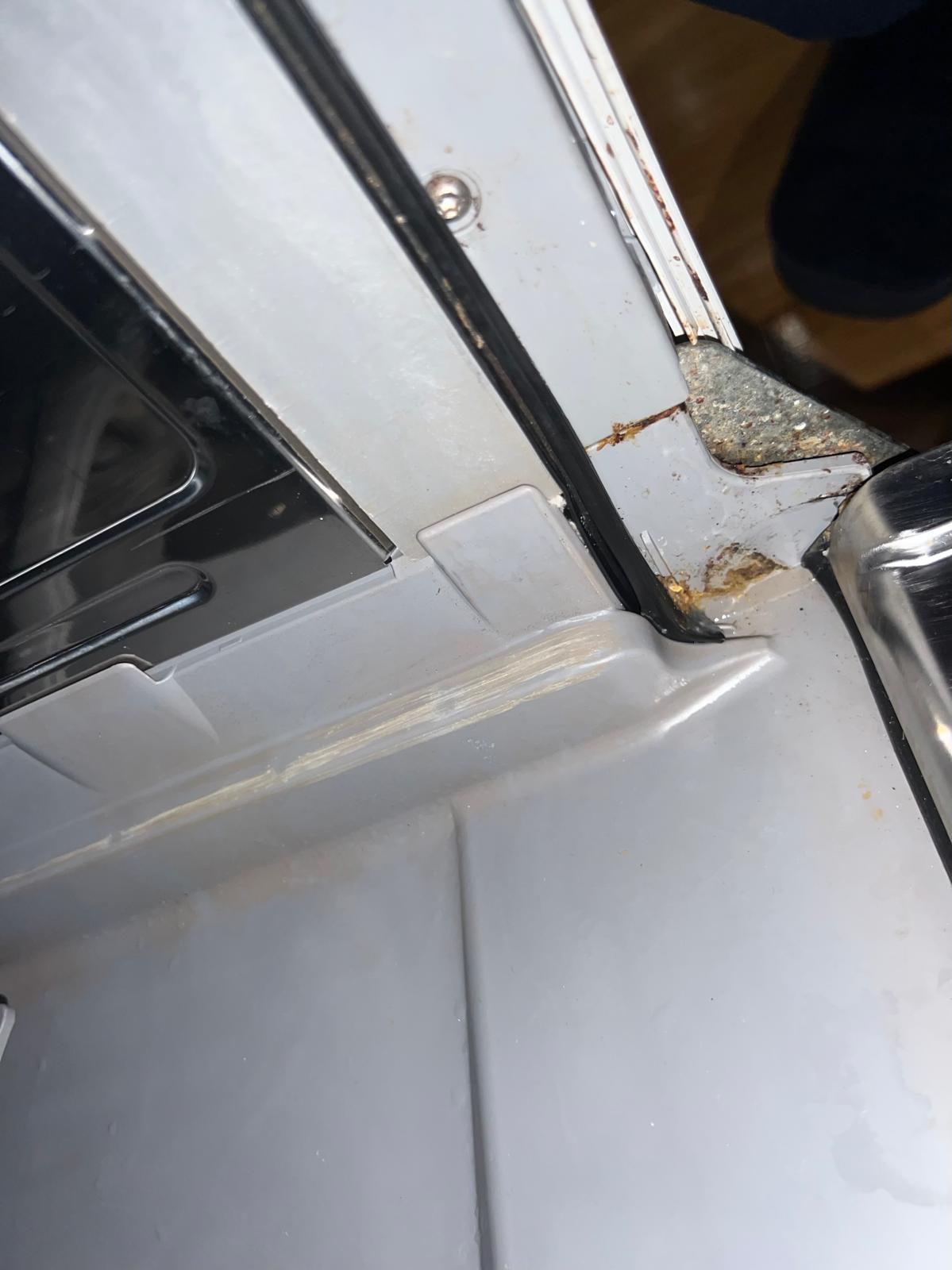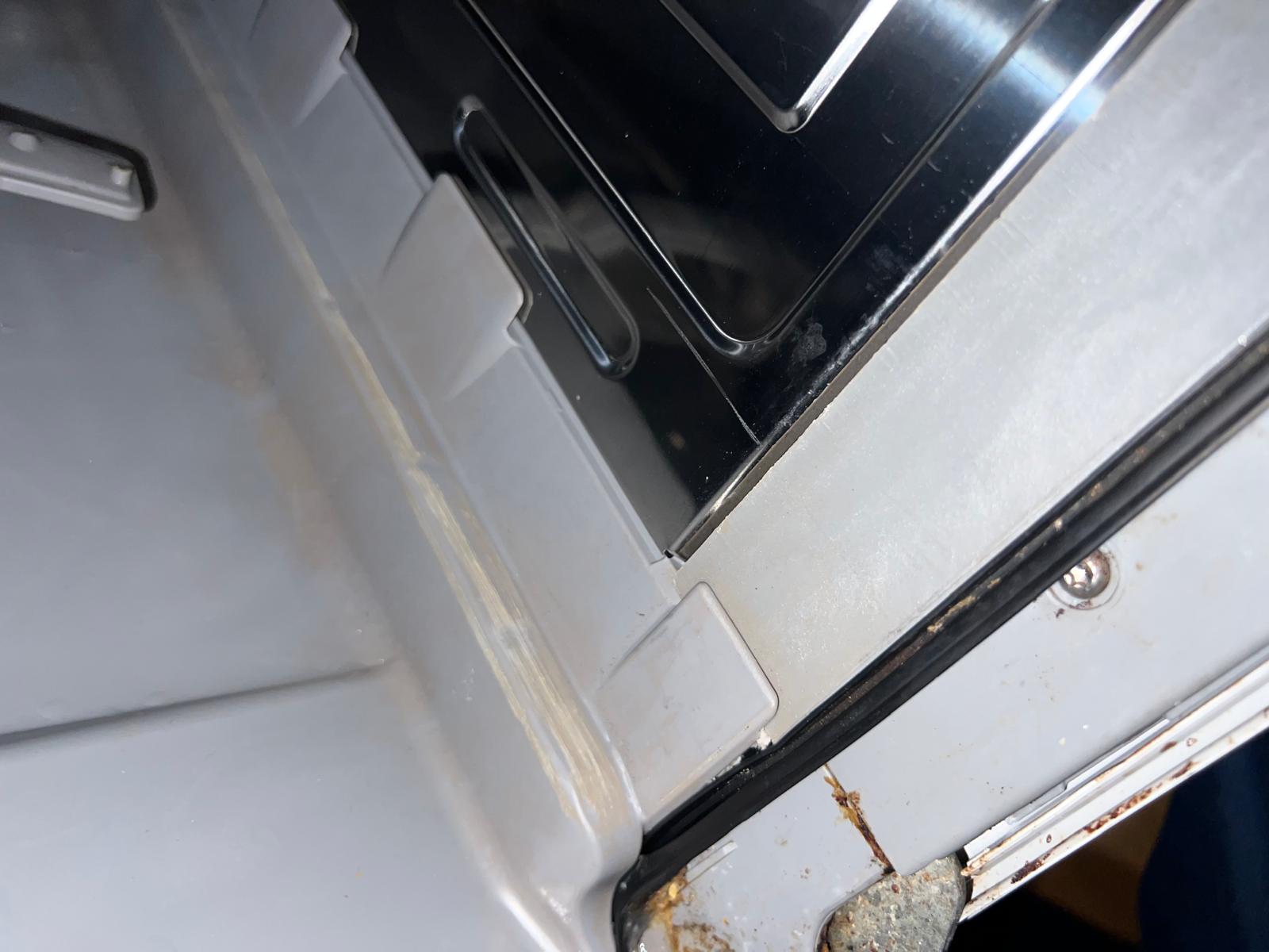 Je vois sur le côté droit quand on est face au côté du lave vaisselle de l'humidité sous le plastique + une sorte de graisse dissoute mouillée entre deux zones plastique et métallique.