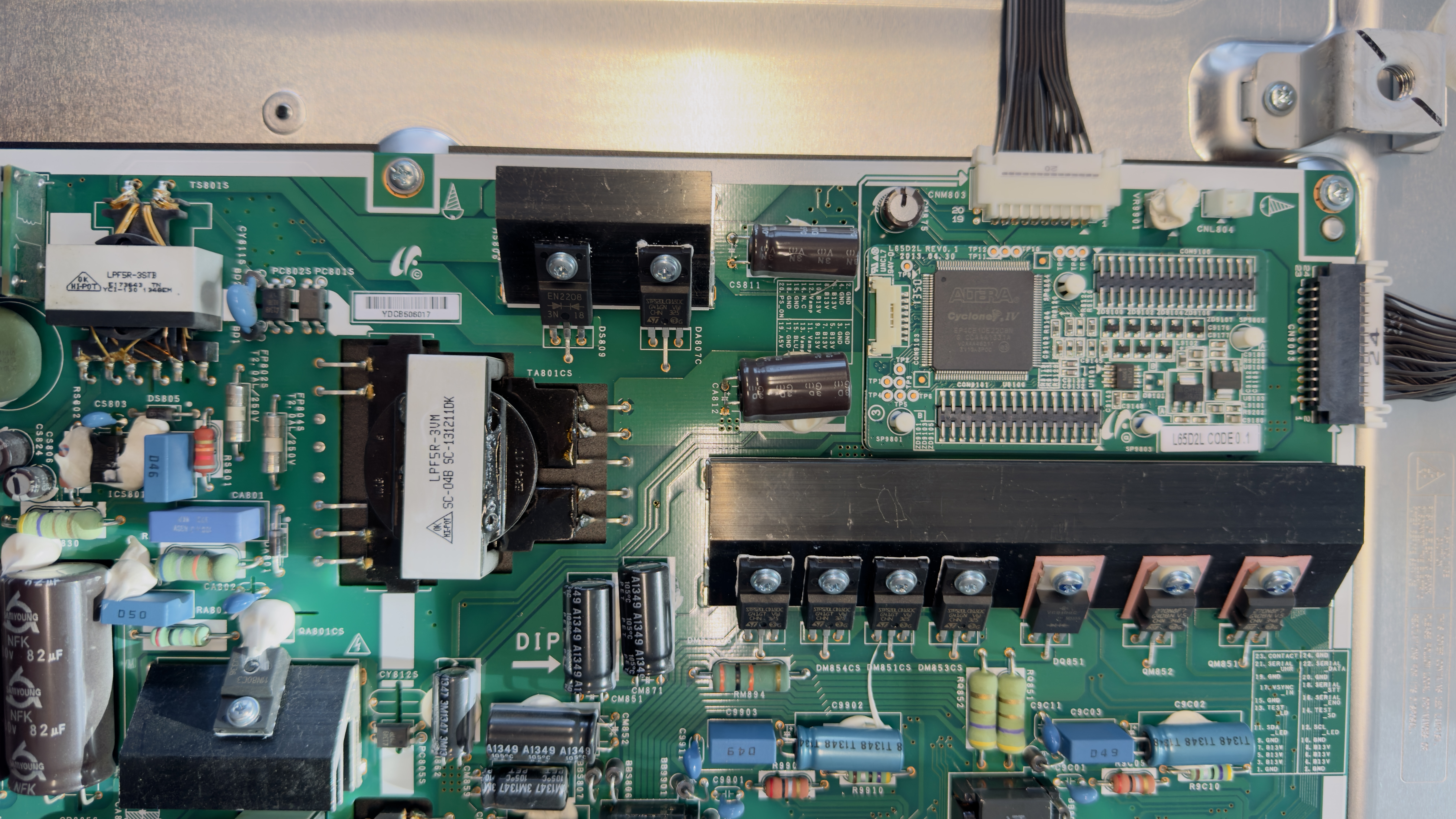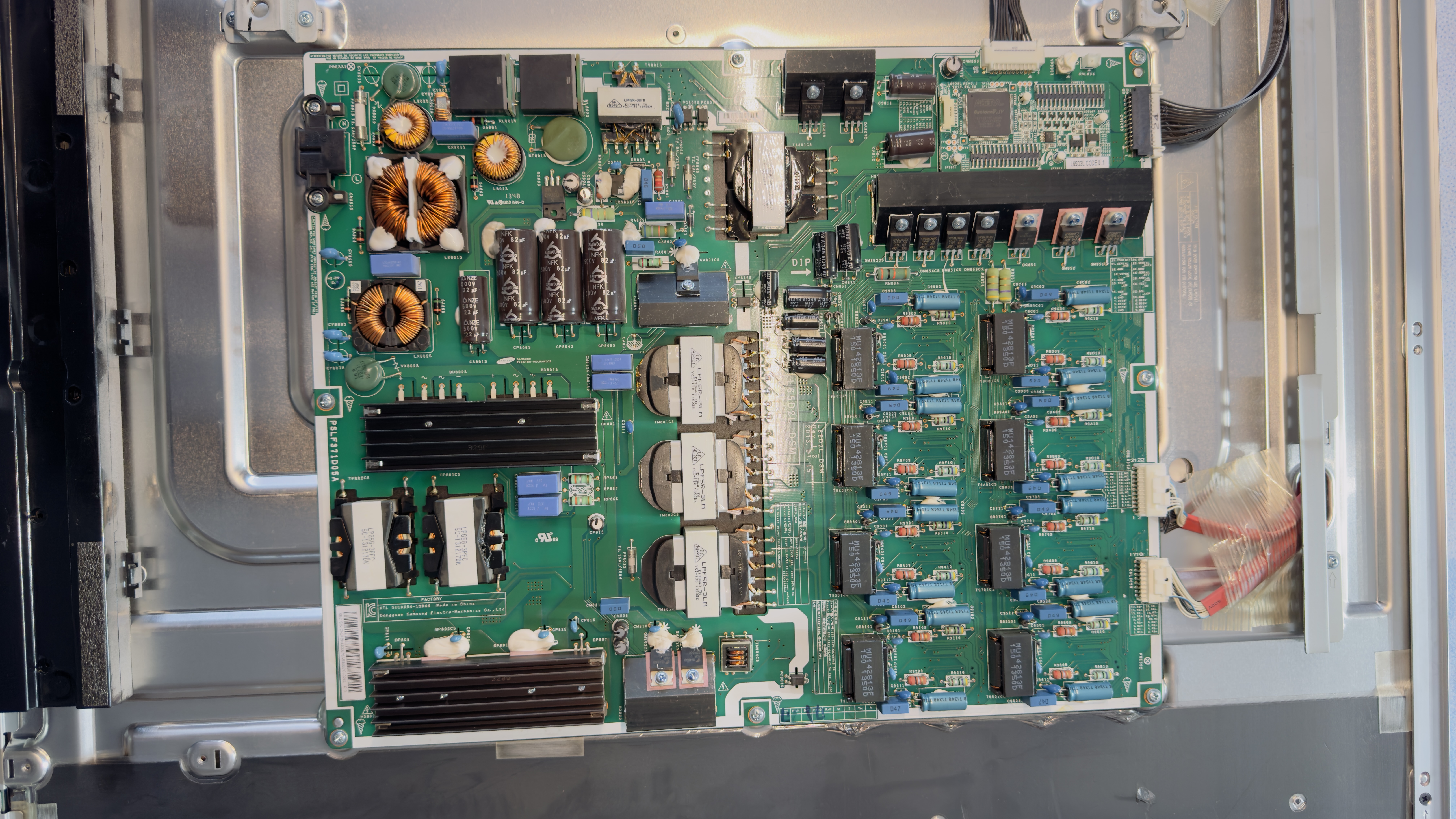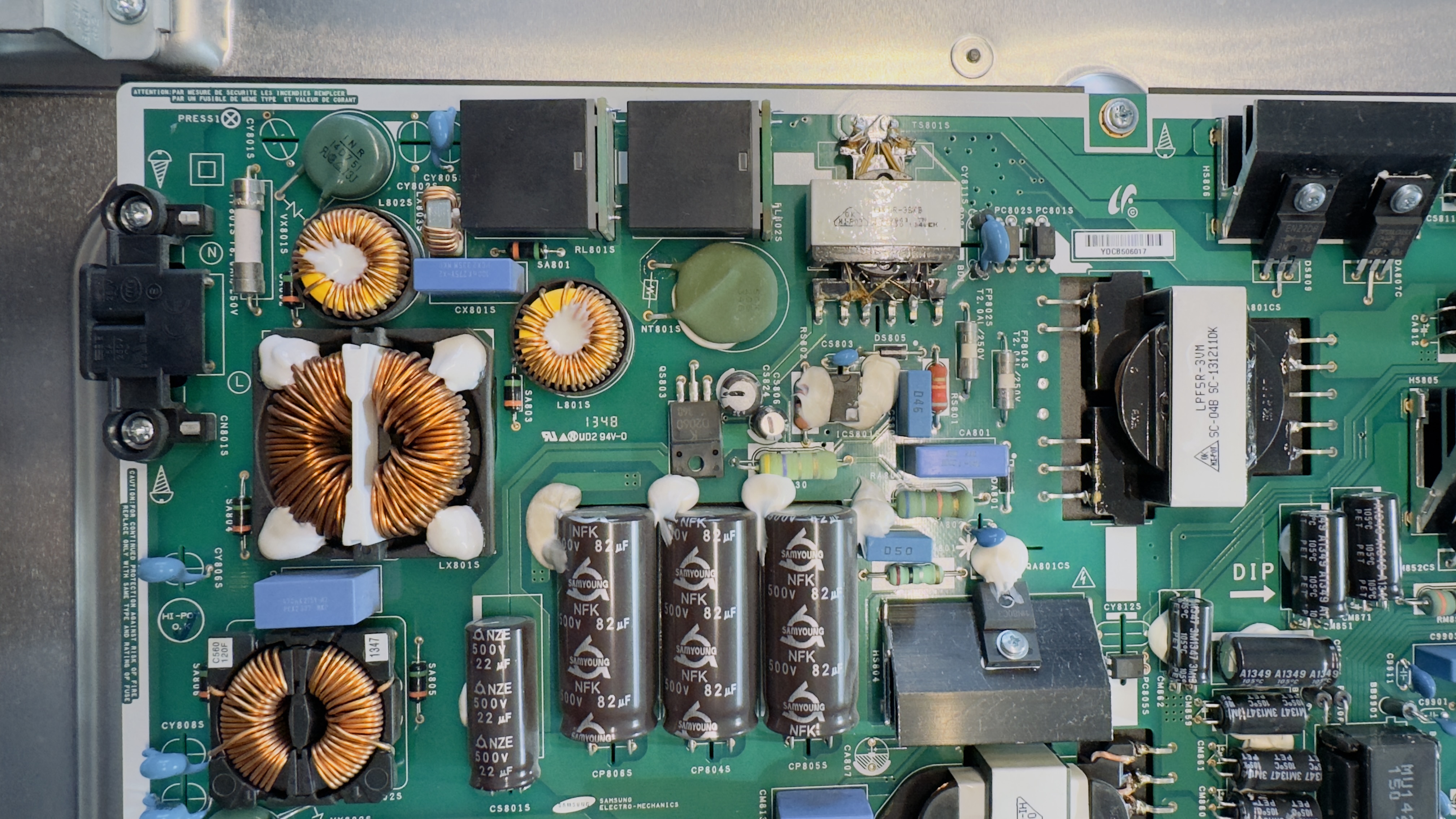 Sur la carte d'alimentation, j'ai recherché des condensateurs anormaux, des traces de chauffe sans rien trouver d'anormal. J'ai mesuré la valeur équivalente des condensateurs principaux (après décharge) et cela semble coller. J'ai ensuite refait proprement (aspiration totale + nouvel apport) les soudures de l'ensemble des composants "mécaniquement lourd" et recherché des soudures sèches, sans en trouver.