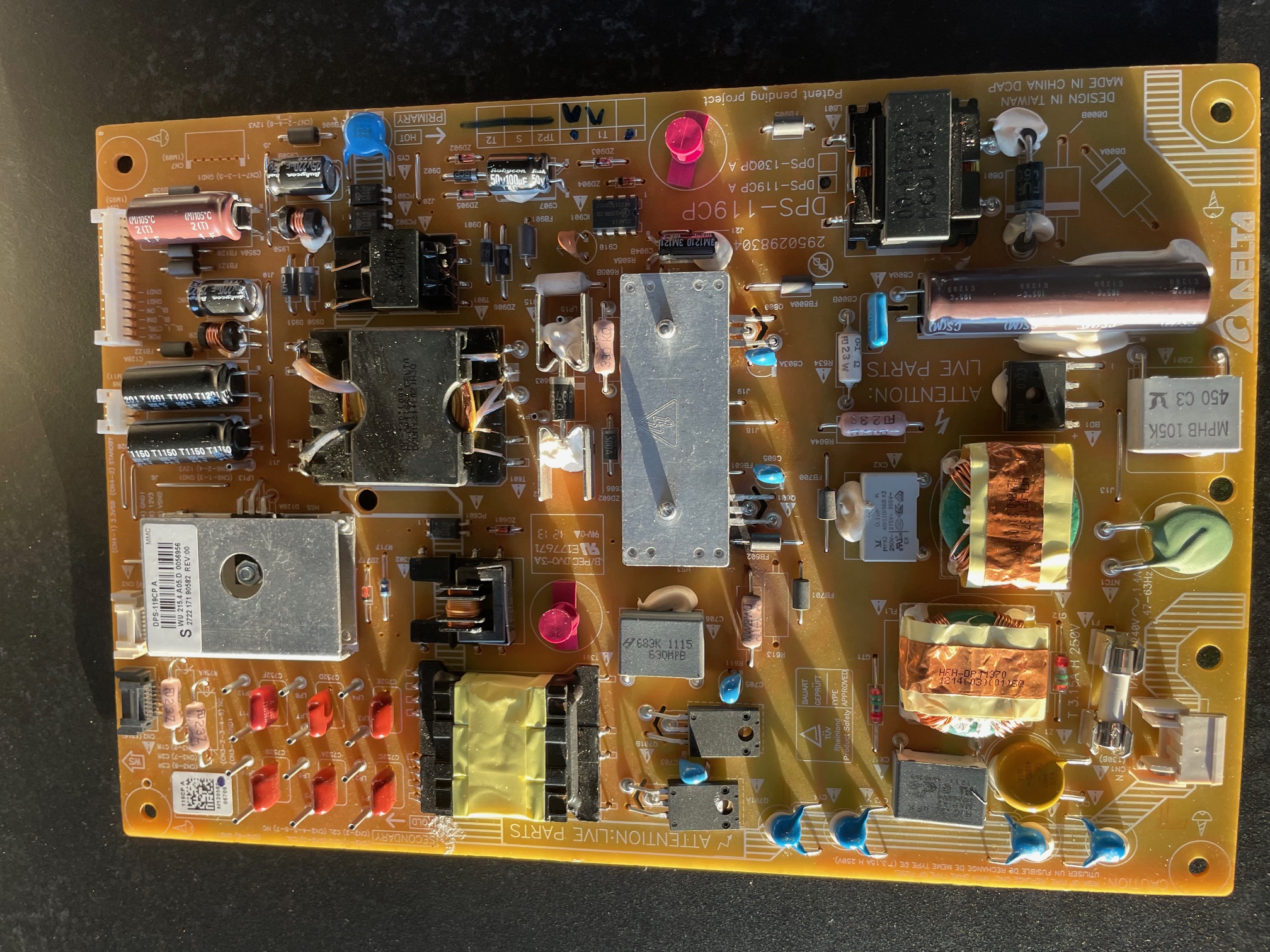 J'ai recupéré ce téléviseur qui partait à la poubelle, parès mise sous tension rien ne fonctionnait, j'ai donc décidé de démonter le téléviseur pour vérifier la carte d'alimentation dont la réference est DPS-119CP. Après inspection j'ai remarqué que le mosfet réference Q601 sur l'alimentation avait littéralement explosé.