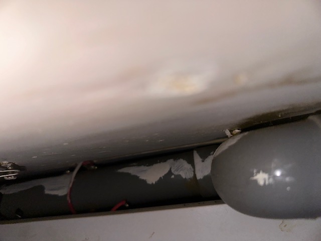 Dans l’échangeur le circuit de vidange proprement dit (conduit en forme de U inversé en bas à gauche) n’est encombré d’aucun dépôt et comme le tuyau de vidange extérieur est propre intérieurement et que son extrémité libre n’est pas trop enfoncée dans l’évacuation murale, l’obstruction du circuit de mise à l’air libre de la vidange dans l’échangeur ne devrait pas être le problème.