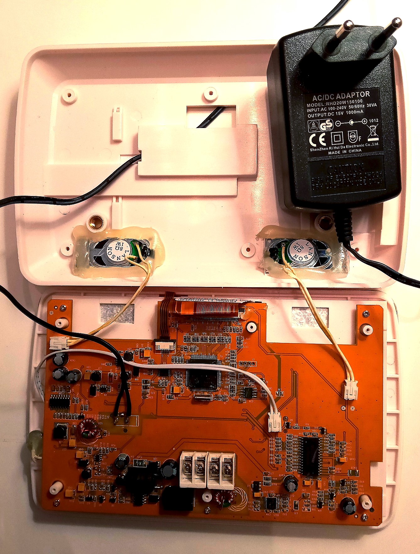 Première surprise, ça ne fonctionne pas. Le 15 volts est présent au niveau des fils soudés (vérifié au multimètre) mais le visiophone ne s'allume pas (et il n'y a pas d'erreur d'inversion +/-...).