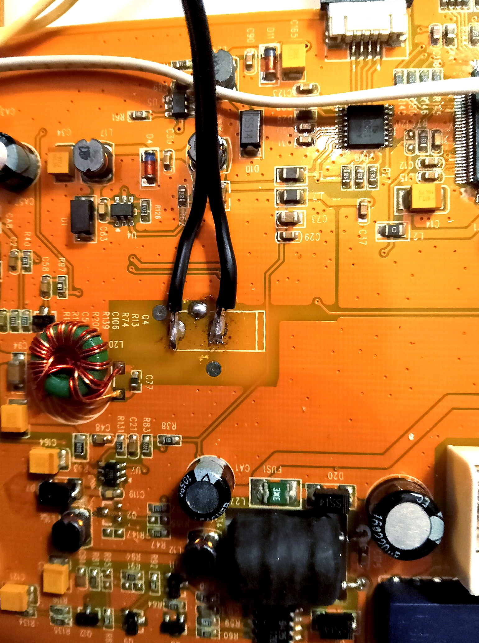 3 - Je constate à chaque touché du fil sous tension avec son plot, une petite étincelle caractéristique d'un effet selfique ou capacitif. Il y a d'ailleurs juste après les soudures un petit bobinage (filtre ?) et peut-être des condensateurs.