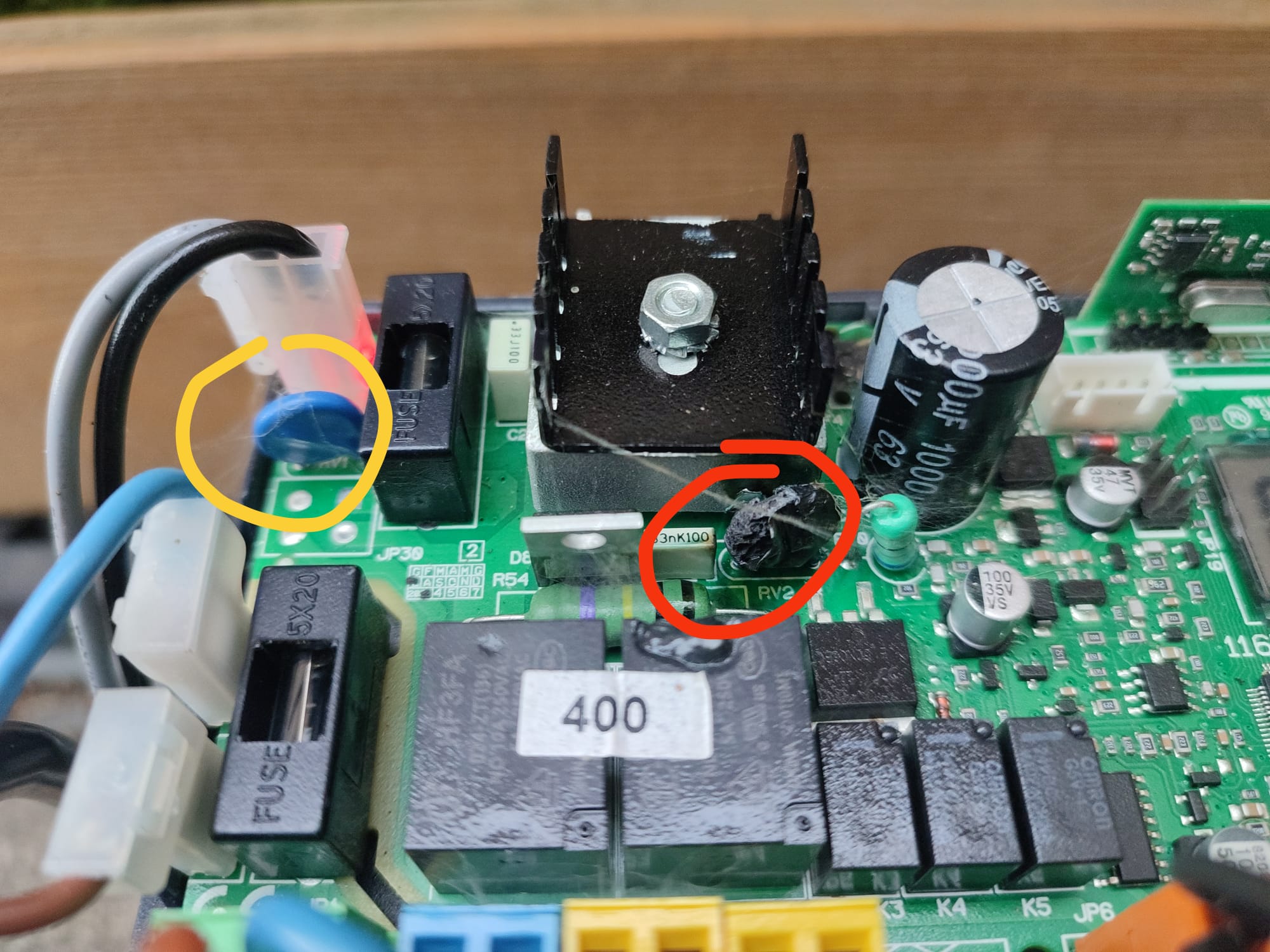 Il semblerait qu'il ait subi une surchauffe car le composant varistance repéré RV2 a vraisemblablement brulé.