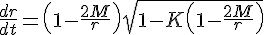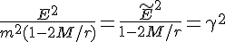 E c'est l'énergie de la particule mesurée par un immobile de Schwarzschild situé arbitrairement loin. La définition est confortable quand E est supérieure à m (v>vlib), car l'immobile et la particule peuvent se croiser (au moins en principe) et E est donc simplement g(U,P) avec U la 4-vitesse de l'immobile (coordonnées arbitrairement proches de (1,0) car r est arbitrairement grand) et P la 4-impulsion de la particule de masse m. Dans le cas contraire (E<m) la particule ne peut pas rejoindre un immobile de Schwarzschild situé arbitrairement loin (au mieux ce sera celui en r_max), et cet immobile ne peut donc mesurer E directement, c'est donc moins confortable. E est alors g(u,P), avec u un 4-vecteur de coordonnées (1,0), comme la 4-vitesse de l'immobile situé arbitrairement loin, mais qui du coup n'est pas la 4-vitesse d'un immobile qui croise la particule (et qui mesurera une énergie différente de E, d'un facteur). Je n'ai pas encore bien tout saisi à ce propos, à savoir est-ce qu'il y a un transport parallèle? de quel vecteur? suivant quel chemin? pour amener la 4-impulsion de l'objet en r quelconque jusqu'à l'immobile situé arbitrairement loin par exemple? Le seul truc net, c'est que E=g(u,P) avec u: (1,0) et P la 4-impulsion de l'objet et que u est une 4-vitesse pour un immobile situé arbitrairement loin et que cela coïncide alors avec l'énergie qu'il mesure.