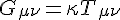G est le tenseur d'Einstein (combinaison du tenseur de Ricci et du tenseur de courbure scalaire), kappa c'est 8 pi G / c^4 (ici G est la constante de gravitation) et on peut ajouter un terme de constante cosmologique.