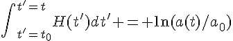 Avec H constant (comme dans un modèle d'espace-temps spatialement plat, vide de matière et avec constante cosmologique non nulle), cela donne H.(t-t0) = ln(a(t)/a0), autrement dit : a(t)/a0 = exp(H.(t-t0)).