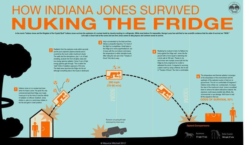 Il y'a un court article, mais c'est surtout la vidéo qui va avec qu'il faut regarder, où deux types calculent les effets de l'explosion de la bombe nuclaire au début du film Indiana Jones 4.