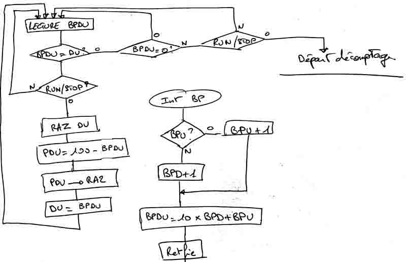 Maintenant que j'ai le même nombre sur les digits de décomptage et sur les digits de programmations, je peux dire que DU=BPDU et je boucle en lecture BPDU, je teste si BPDU = DU, oui?, alors je teste si BPDU =0, non?, alors j'attends l'appuie sur run/stop, et je boucle comme ça j'usquà ce que j'appuie sur run/stop et après, c'est le départ décomptage.