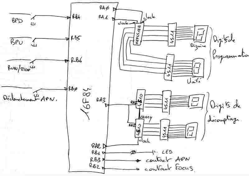 - 1 autre appuie sur run/stop et je lance le décomptage, lorsque celui-ci arrive à zéro, il déclenche l'apn et repart à la valeur indiqué par les digits du haut (digits de programmation).