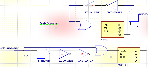 Lorsqu' un front montant arive à la clock , j'aimerais qu'il compte 2 ( compteur bcd cd4518 qui capte une clock de fréquence max de 3 Mhz et de largeur mini de 100 ns)