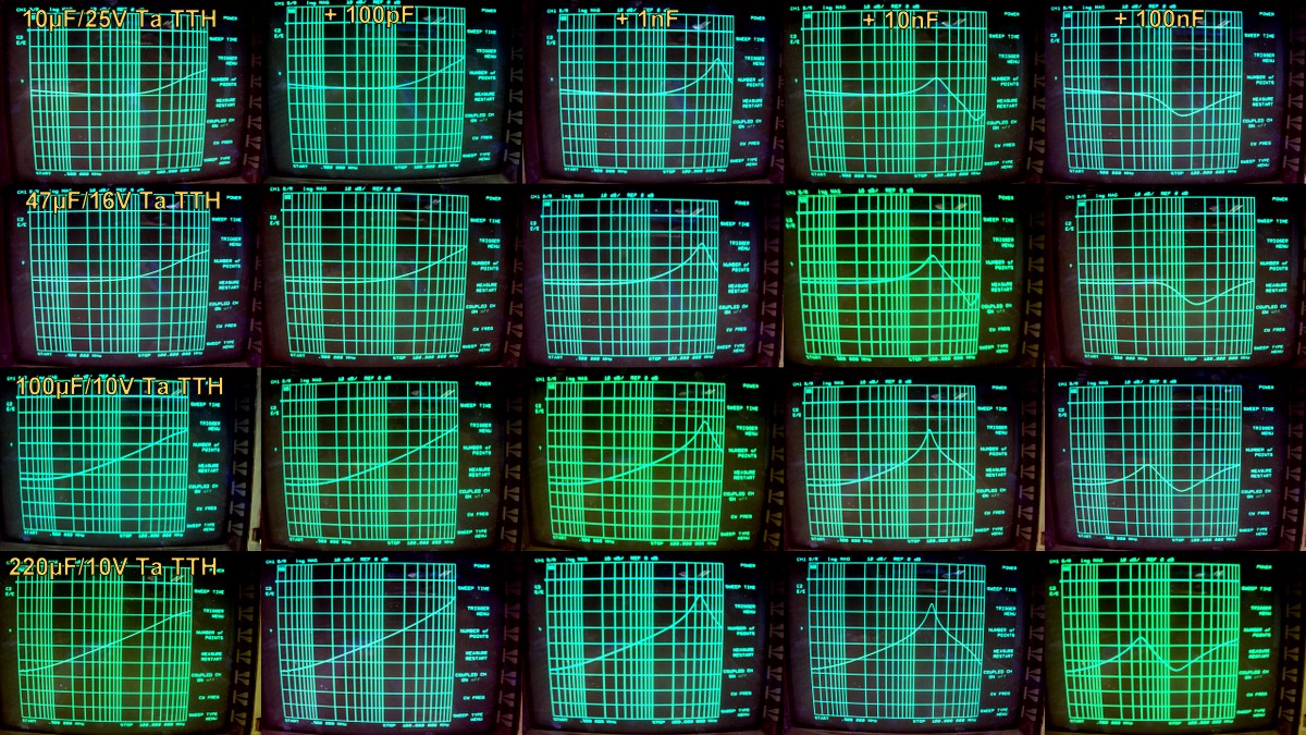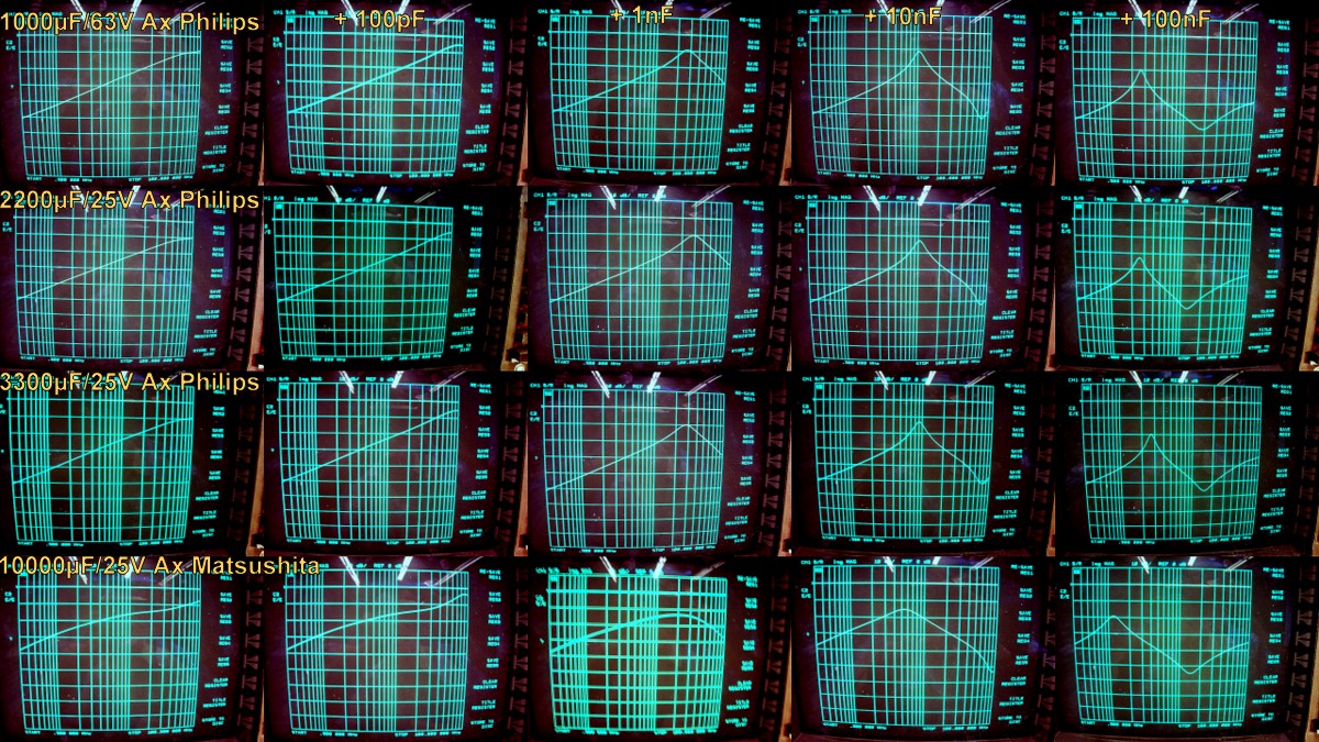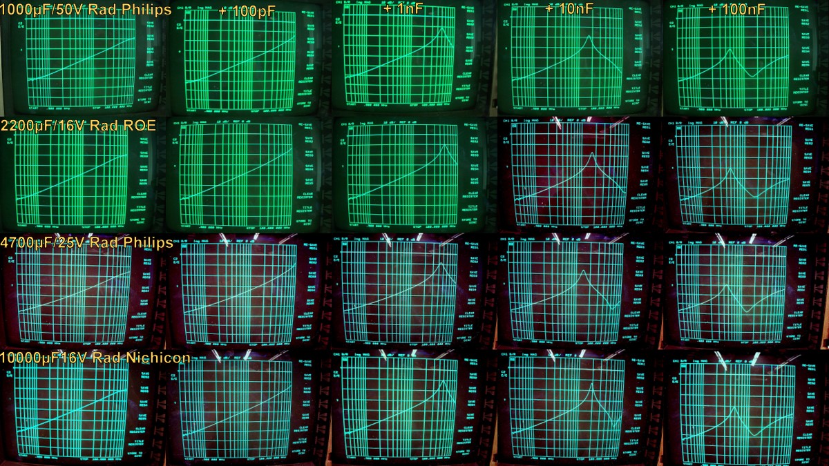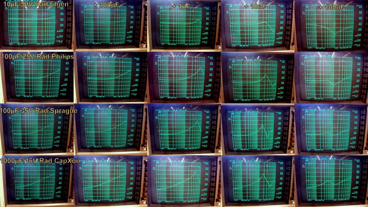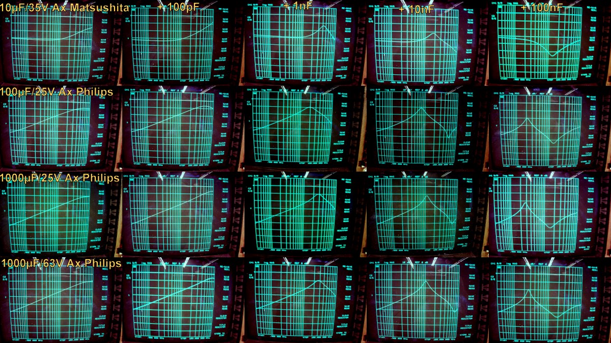 J'ai effectué un test systématique sur un échantillonnage de condensateurs couvrant toutes les valeurs courantes, en radial et axial, seuls ou en association avec des condensateurs céramique de 100pF, 1nF, 10nF et 100nF.