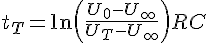 Uo est la tension de départ sur le condensateur, qui vaut +0.5 vu des résistances, U∞ est la tension finale sur le condensateur, donc -1 en conservant la convention précédente et Ut est la tension au seuil qui nous intéresse, 0.5*Vdd en absolu, soit -0.5 vu du condensateur.
