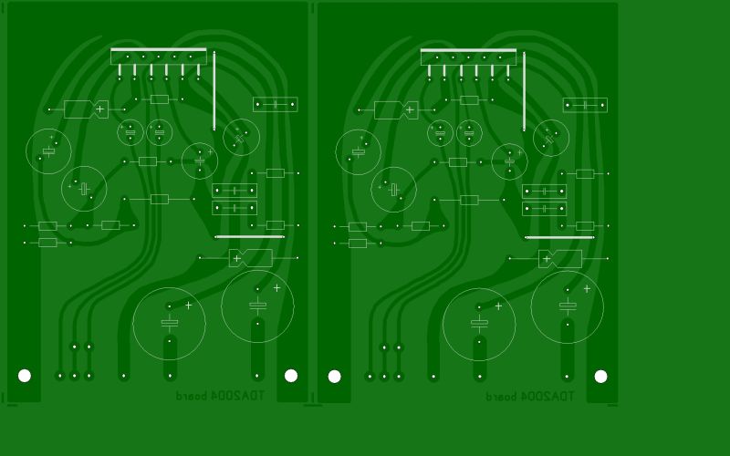 On distinguais que très faiblement la musique derrière un bruit de fond de souffle ect..., jusqu'aujourd'hui je découvre en fouillant me vieux circuit, un circuit d'autoradio avec ce même TDA2004, j'ai donc remplacé l'autre par celui ci sauf que ça reste exactement pareil, quel autre composant pourrais en être la cause?(j'ai essayé de faire entrer le signal sans passer par les condensateur de 2.2uF et avec la sortie au parleur avant les condensateurs de 2200uf mais sans plus de résultat)