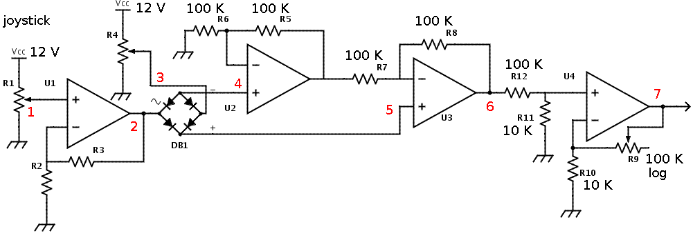Comme on peut le voir, la tension du commande du VCO (point 7) redescend très proche de zéro lorsqu'on laisse le manche du joystick revenir à la position centrale. La zone morte avec le joystick dans cette position (causée par le seuil de conduction des diodes du pont) est quasiment inexistante.